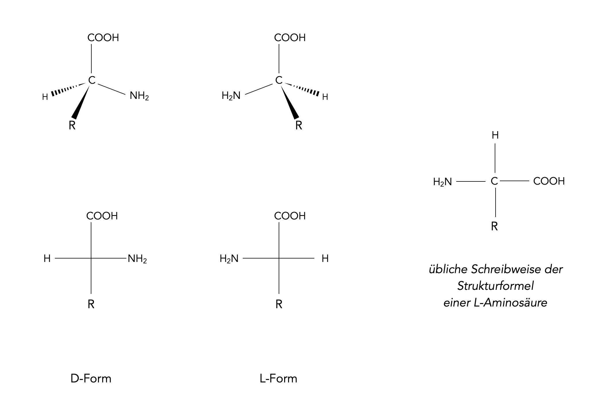 Die beiden anderen Substituenten des zentralen C-Atoms werden an der waagerechten Linie untergebracht. Dazu muss man sich die dreidimensionale Struktur des Moleküls vor Augen halten. Der Substituent mit der höheren Priorität, bei Aminosäuren immer die Amino-Gruppe, befindet sich bei der D-Form rechts, bei der L-Form links.