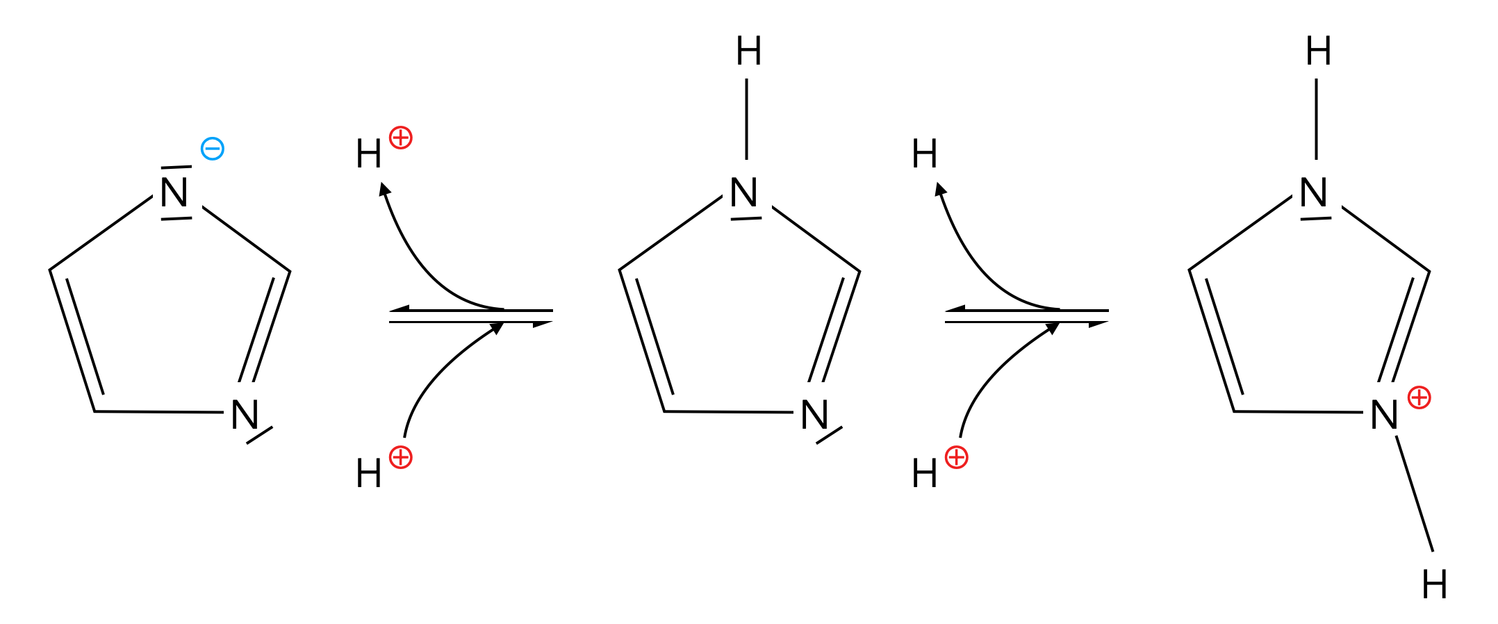 Das H-Atom des einen N-Atoms kann als Proton abgegeben werden (Imidazol als Säure), und das andere N-Atom (das mit dem freien Elektronenpaar außerhalb des Ringes) kann ein Proton anlagern (Imidazol als Base).