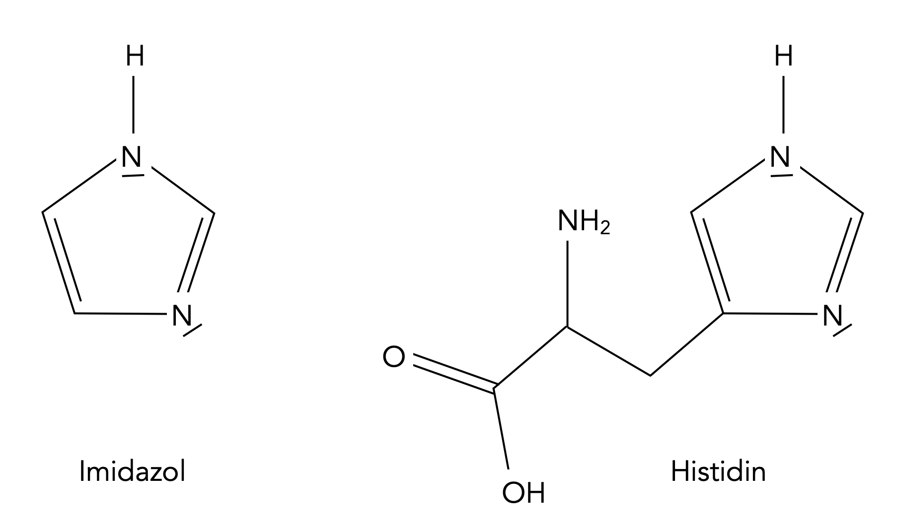 Links im Bild sehen wir die Strukturformel von Imidazol, rechts die Strukturformel der Aminosäure Histidin, in der Imidazol als Baustein der Seitenkette enthalten ist.