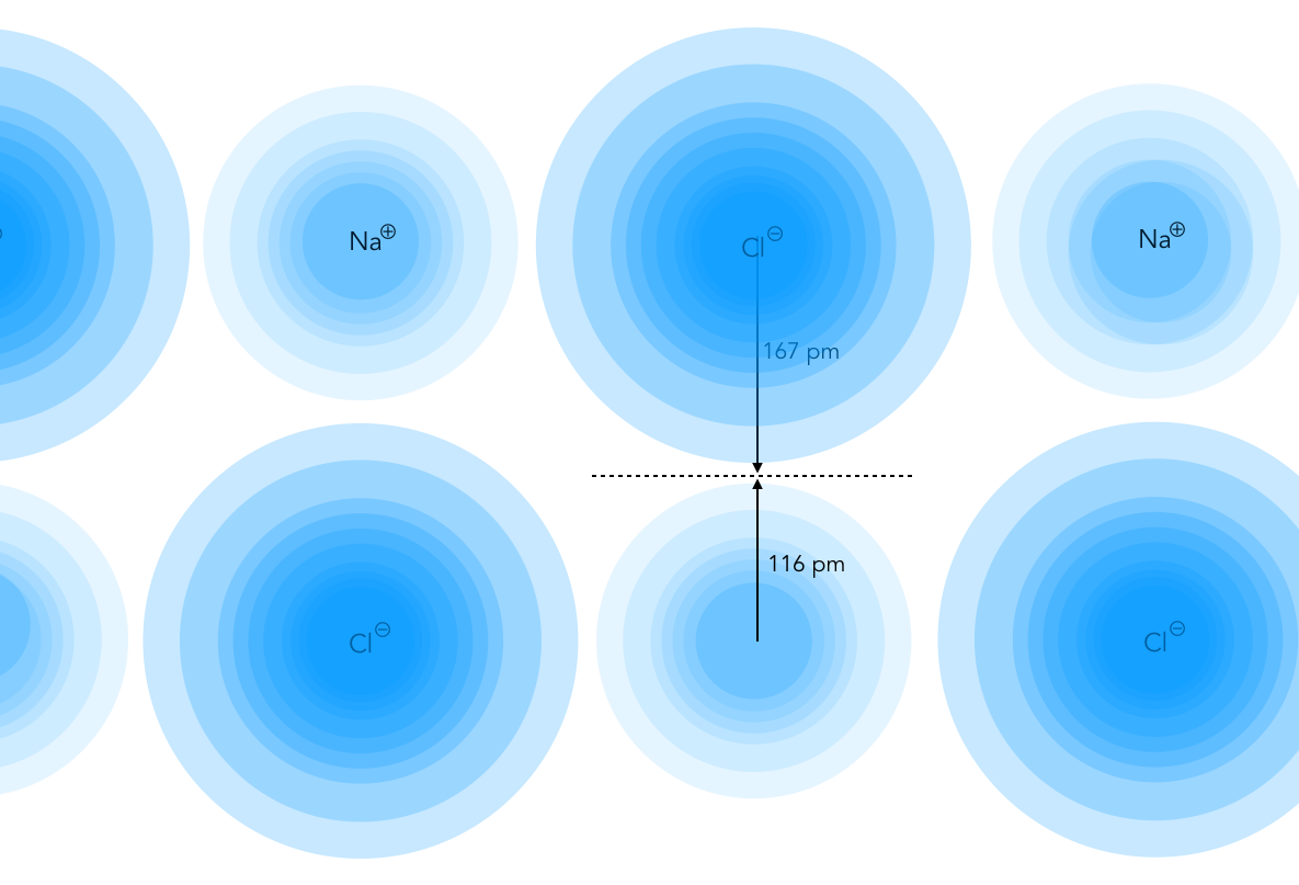 Zur Festlegung des Ionenradius orientiert man sich an den Minima in der Verteilung der Elektronendichte, in der Zeichnung durch eine gestrichelte Linie angedeutet.