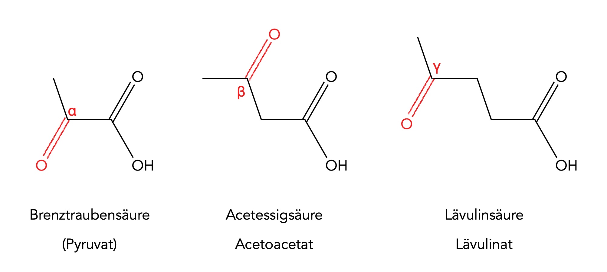 Auf diesem Bild sehen wir die jeweils einfachsten Vertreter der α-, β- und γ-Ketosäuren, nämlich Brenztraubensäure, Acetessigsäure und Lävulinsäure.