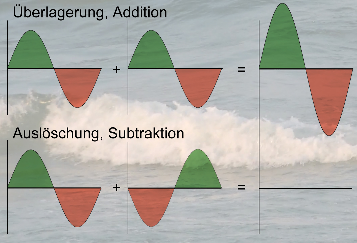 Das andere Extrem liegt dann vor, wenn der Wellenberg der einen Welle exakt auf ein Wellental der anderen Welle trifft. Haben beide Wellen die gleiche Wellenlänge und Amplitude, dann löschen sich die beiden Wellen gegenseitig aus.