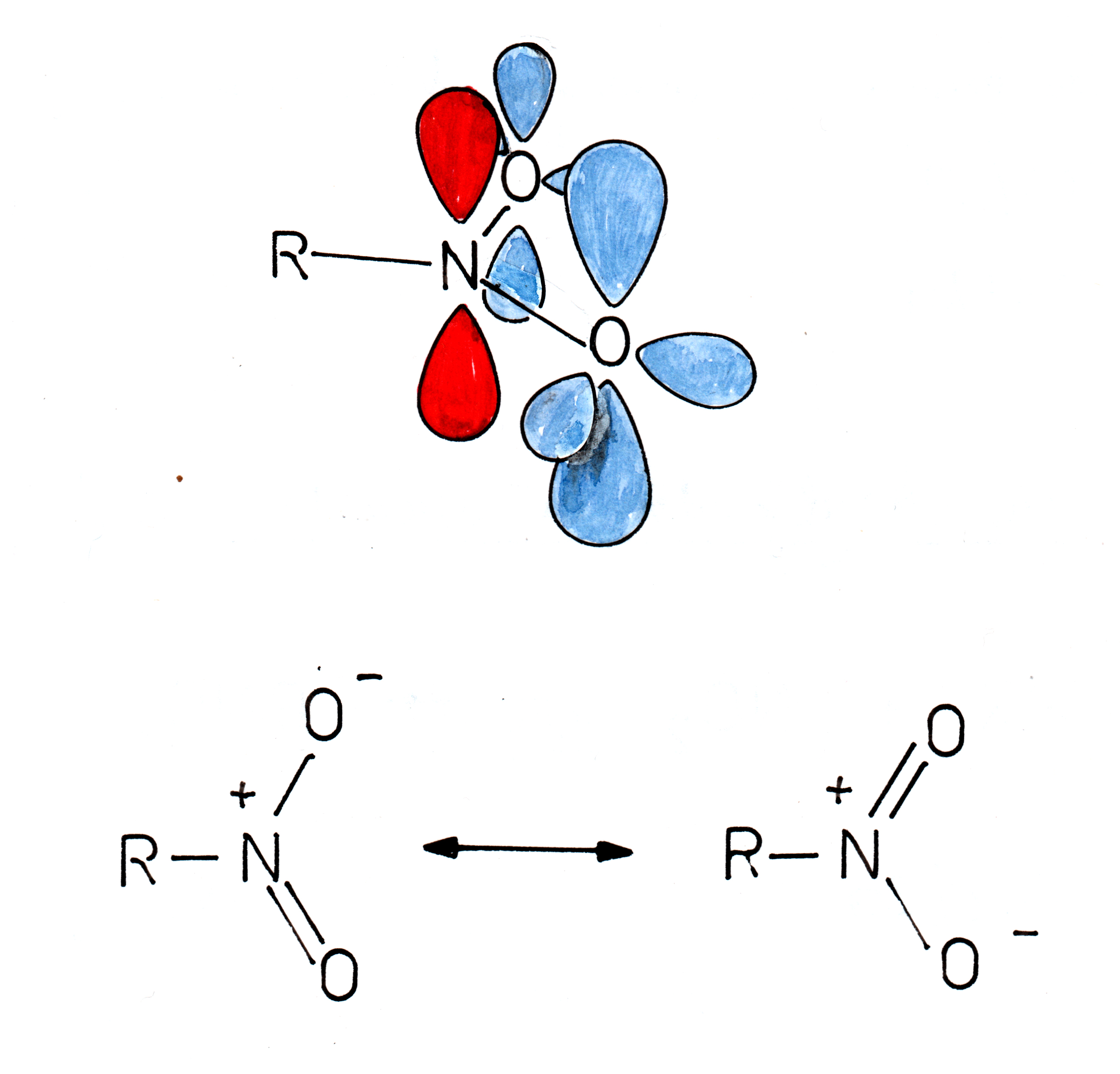Die Nitro- oder NO2-Gruppe besteht aus einem sp2-hybridisierten Stickstoff-Atom und zwei ebenfalls sp2-hybridisierten Sauerstoff-Atomen: