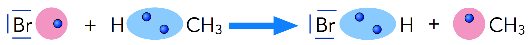 Ein Brom-Radikal abstrahiert ein Wasserstoff-Atom aus einem Methan-Molekül. Dabei entsteht ein Methyl-Radikal.