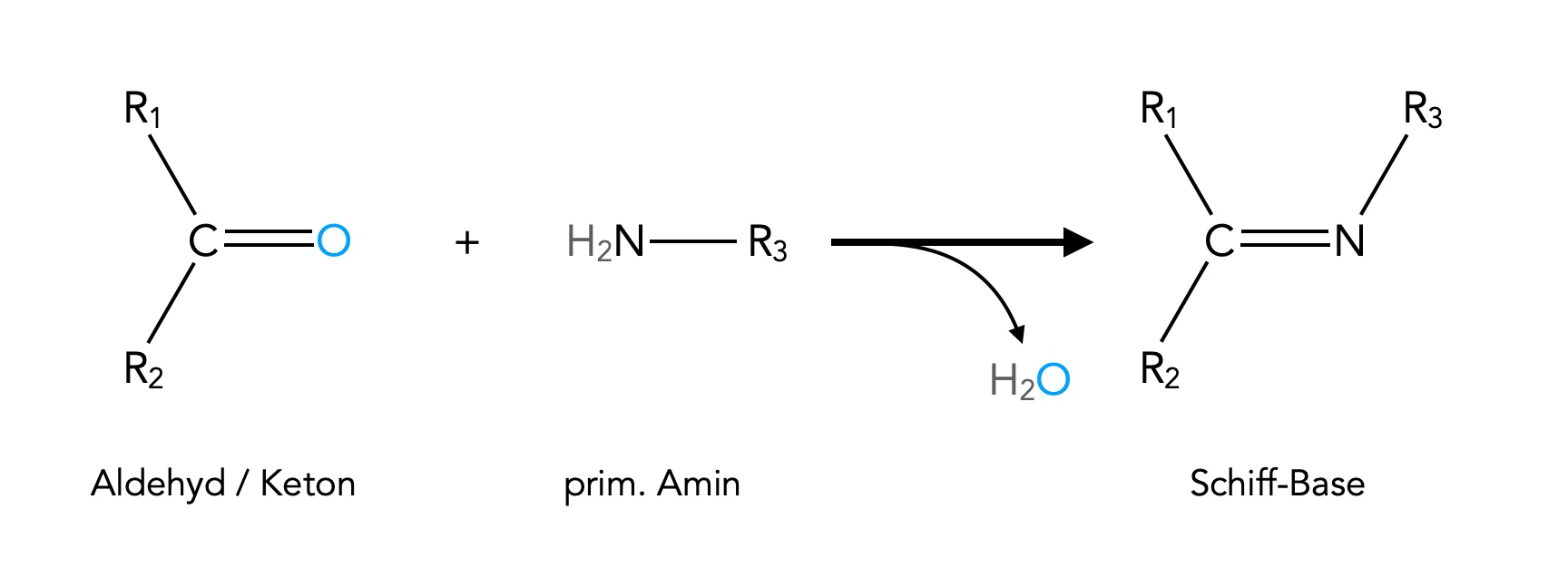Eine Schiff-Base entsteht, wenn eine Aminogruppe eines primären Amins mit der Carbonylgruppe eines Aldehyds oder Ketons reagiert: