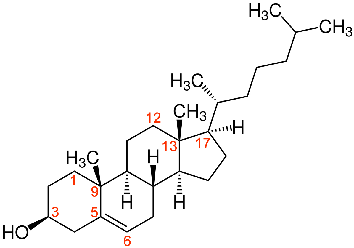 Die Abbildung 1 zeigt das Steroid-Grundgerüst. Die in der Natur vorkommenden Steroide enthalten dieses Grundgerüst, aber auch drei oder mehr unterschiedliche Seitenketten. Ein bekannter Vertreter der Steroide ist Cholesterin. Schauen wir uns mal die Strukturformel von Cholesterin an: