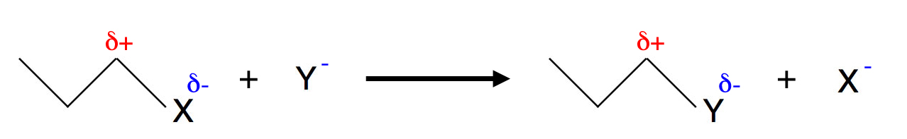 Bei der radikalischen Substitution ist das angreifende Teilchen Y ein Radikal, bei der nucleophilen Substitution ist Y ein Nucleophil, also ein Anion oder ein Molekül mit einer starken negativen Teilladung. Bei der elektrophilen Substitution schließlich ist Y ein Elektrophil, also ein Kation oder ein Molekül mit einer starken positiven Teilladung.