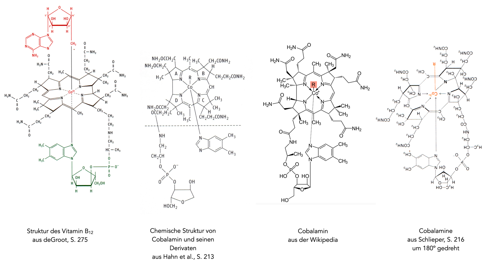 Vergleicht man die in der Wikipedia gezeigte Struktur des Cobalamin-Gerüstes mit den Abbildungen aus verschiedenen Fachbüchern, so erkennt man, dass die Struktur in jedem Buch etwas anders dargestellt wird: