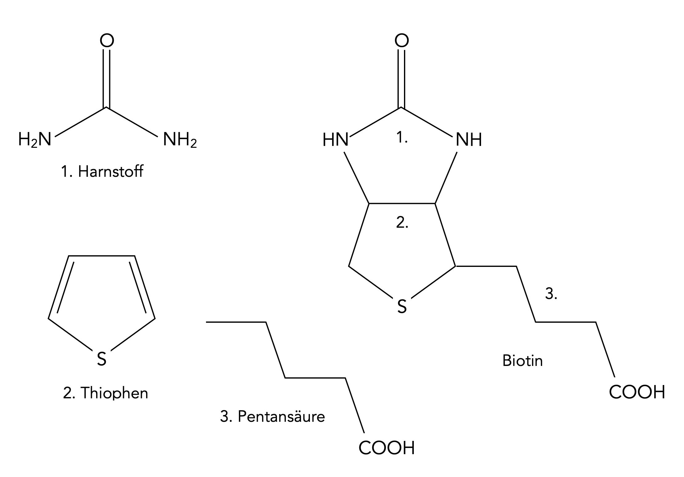 Oben sehen wir die Strukturformel von Biotin. Strukturmäßig setzt sich das Biotin-Molekül aus drei Komponenten zusammen:
