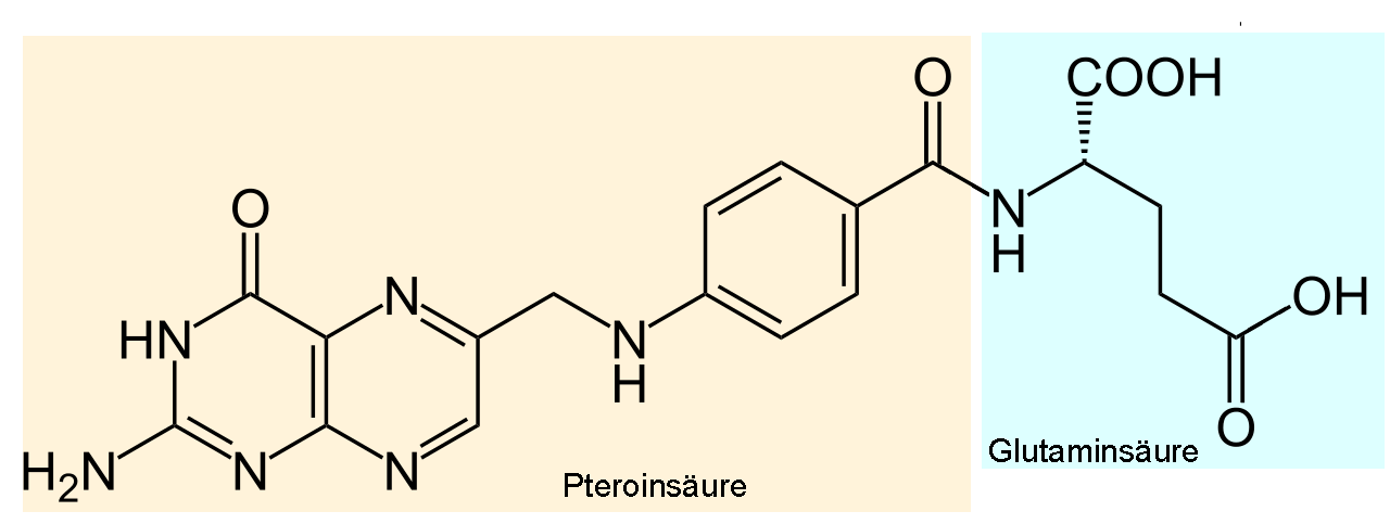 Oben sehen wir die Strukturformel der Folsäure. Strukturmäßig setzt sich das Folsäure-Molekül aus zwei Komponenten zusammen: