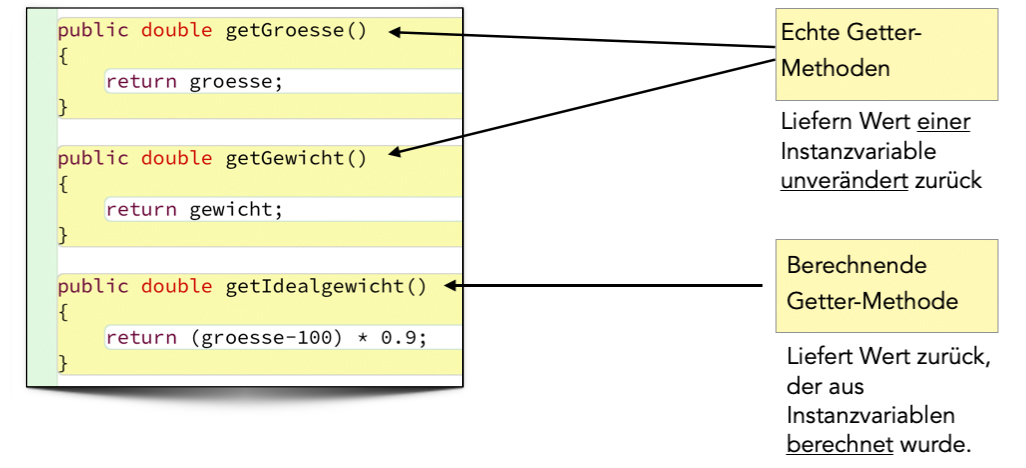 Die Getter-Methode getIdealgewicht() dagegen liefert nicht den Wert einer Instanzvariablen zurück, sondern berechnet daraus einen anderen Rückgabewert, in diesem Fall das Idealgewicht der Person. Solche Getter-Methoden könnte man als "indirekte Getter-Methoden" bezeichnen, in der Fachliteratur spricht man aber meistens von "berechnenden Getter-Methoden".