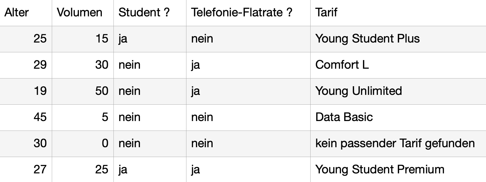 Zurückgegeben werden soll ein String mit dem Namen des empfohlenen Tarifs.