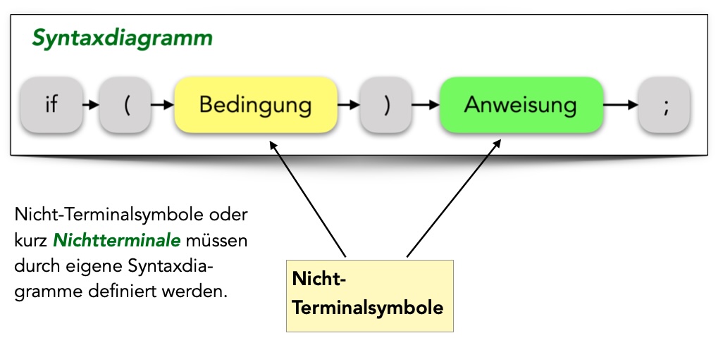 Ein Syntaxdiagramm besteht aus Terminalsymbolen (kurz: Terminalen) und Nichtterminalsymbolen (kurz: Nichtterminalen), die durch Pfeile miteinander verbunden sind. Wir wollen das obige Syntaxdiagramm einmal gemeinsam lesen: