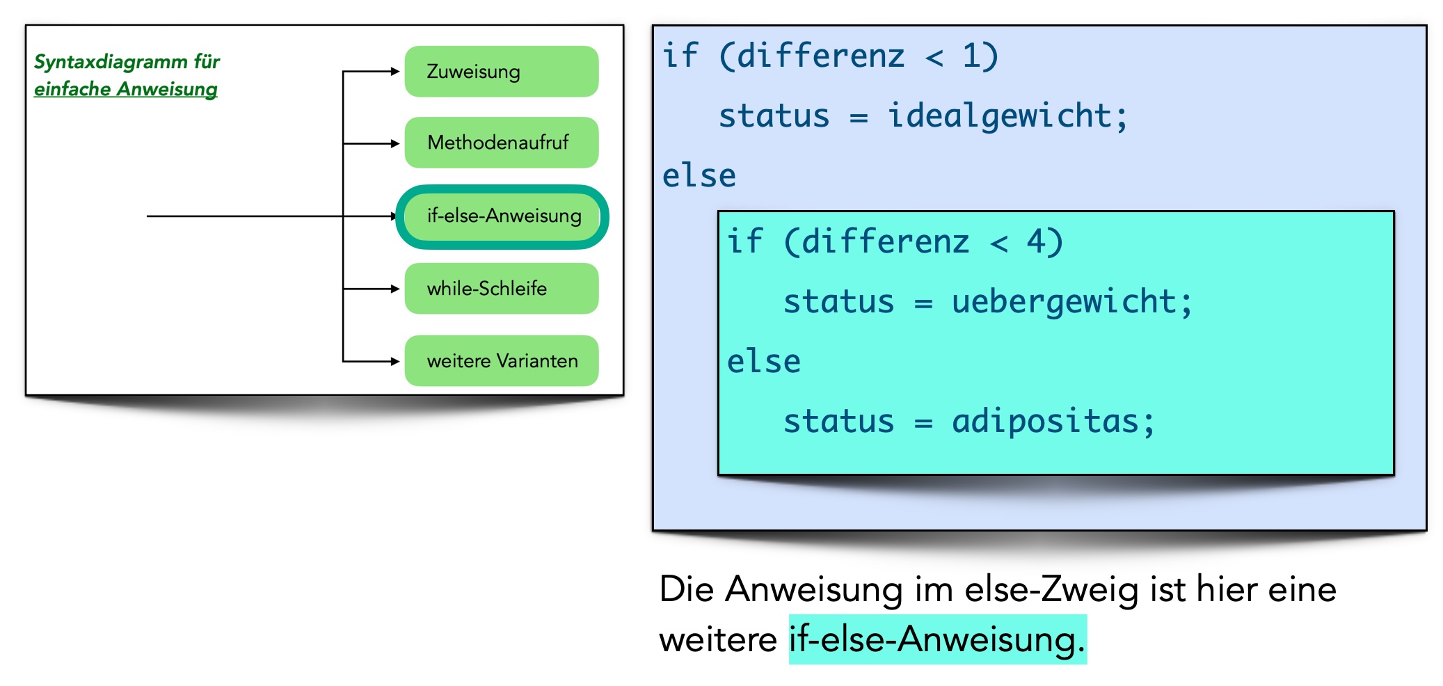 Denken Sie daran, dass auch die alternative Anweisung im else-Zweig eine einfache Anweisung oder ein Anweisungsblock sein kann.