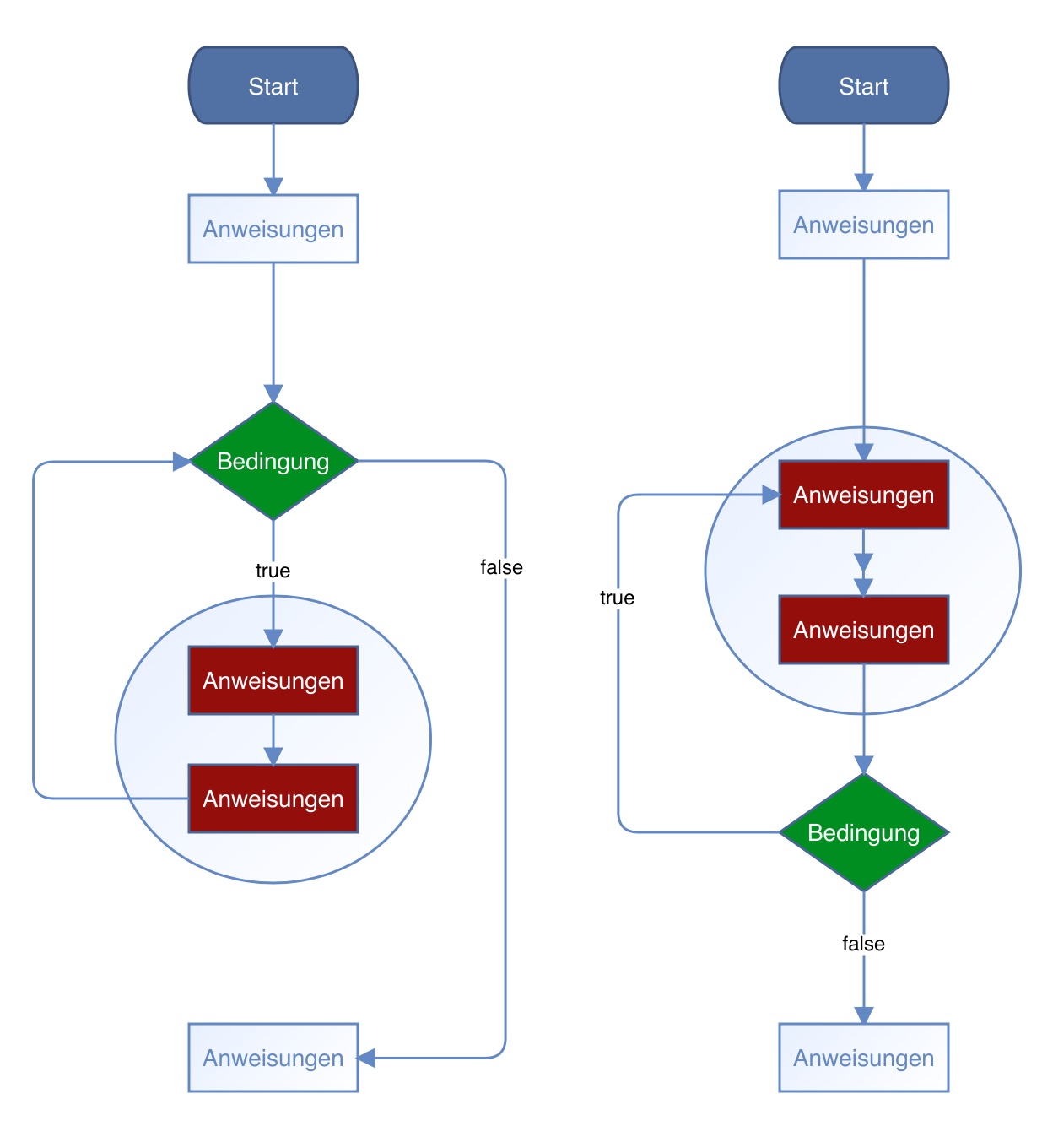 Im Gegensatz dazu wird bei einer nachprüfenden Schleife (rechts) die Schleifenbedingung erst nach dem ersten Schleifendurchlauf überprüft. Die Anweisungen im Schleifenkörper werden also mindestens einmal ausgeführt. Die einzige nachprüfende Schleife in Java ist die do-while-Schleife.