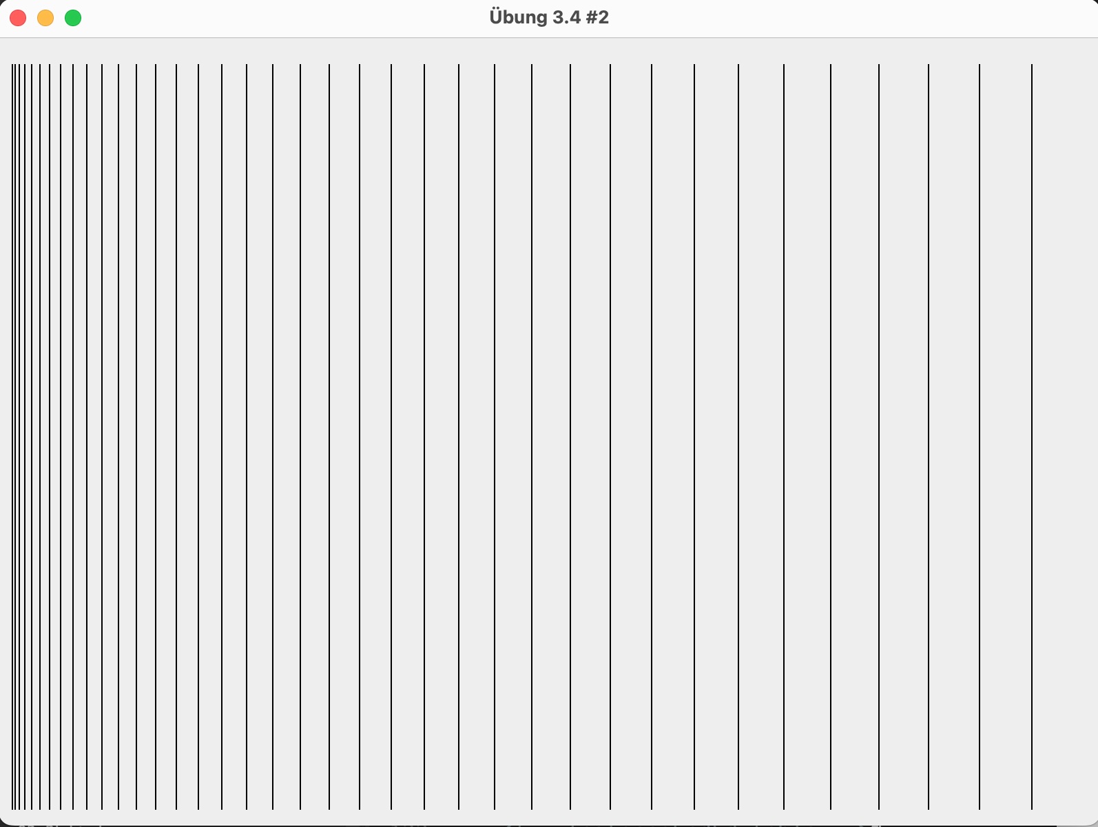 Wie Aufgabe 1, nur soll der Abstand zwischen den Linien kontinuierlich zunehmen, erst 2 Pixel, dann 3 Pixel, dann 4 Pixel und so weiter. Der rechte Rand des Fensters soll aber nicht ganz erreicht werden.
