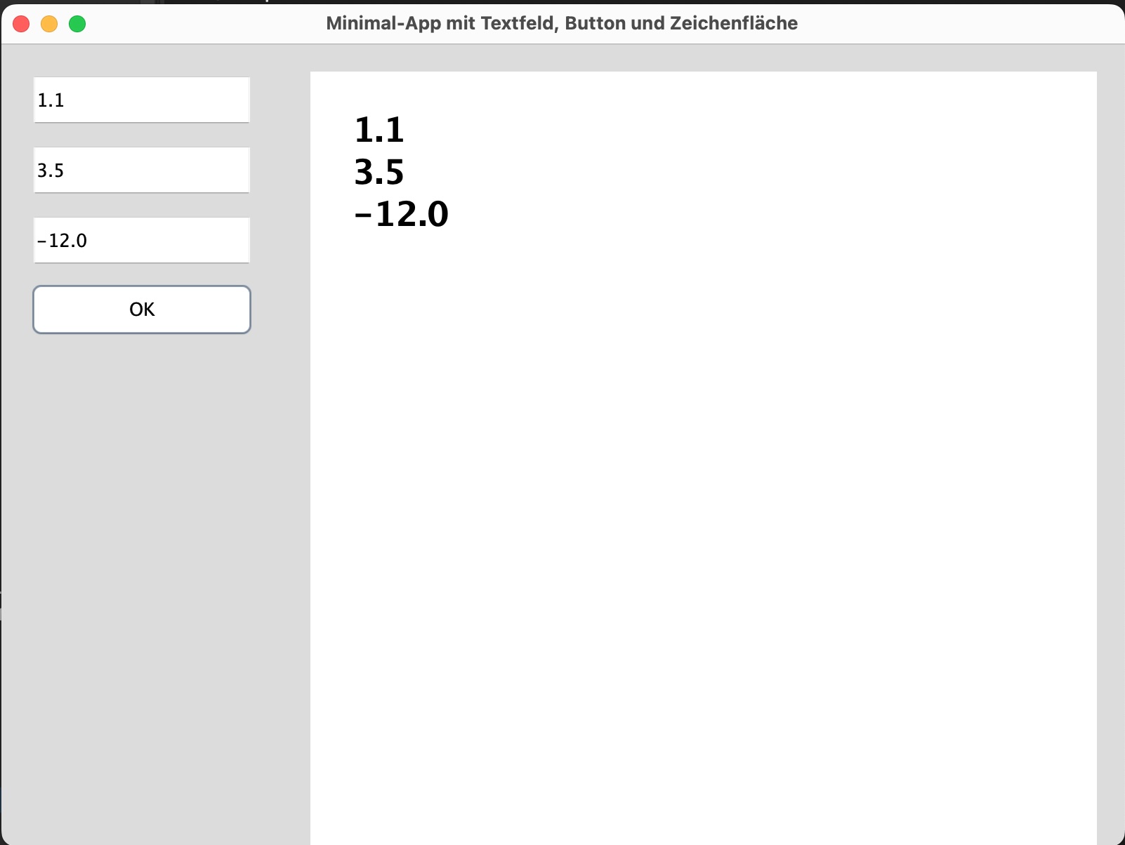 In dem Zeichen-Panel lassen Sie dann die drei eingelesenen Zahlen untereinander anzeigen. Es findet noch keine Fehlerüberprüfung statt, Fehleingaben führen zu einem Laufzeitfehler. Also geben Sie bitte nur Zahlen in die drei Textfelder ein.