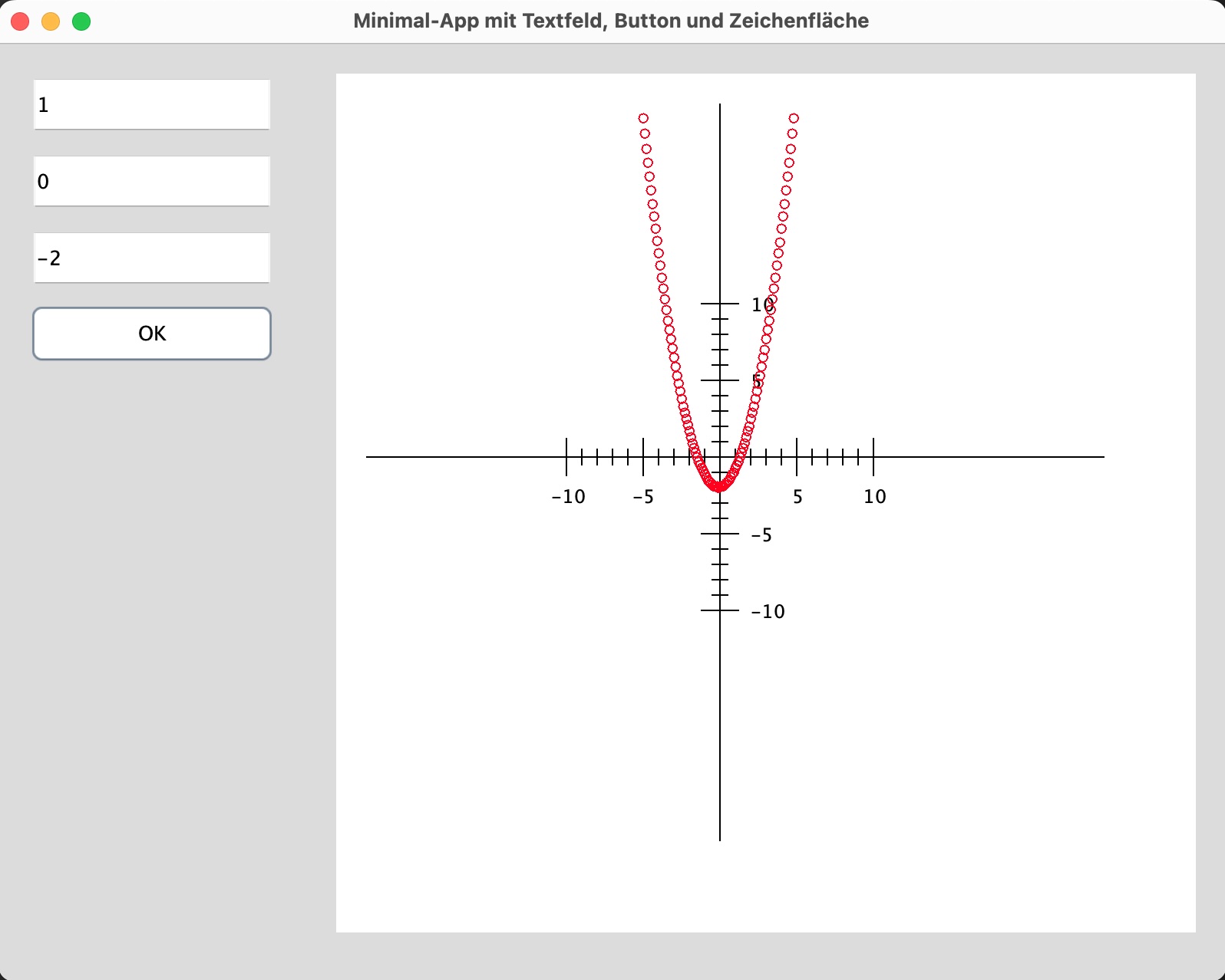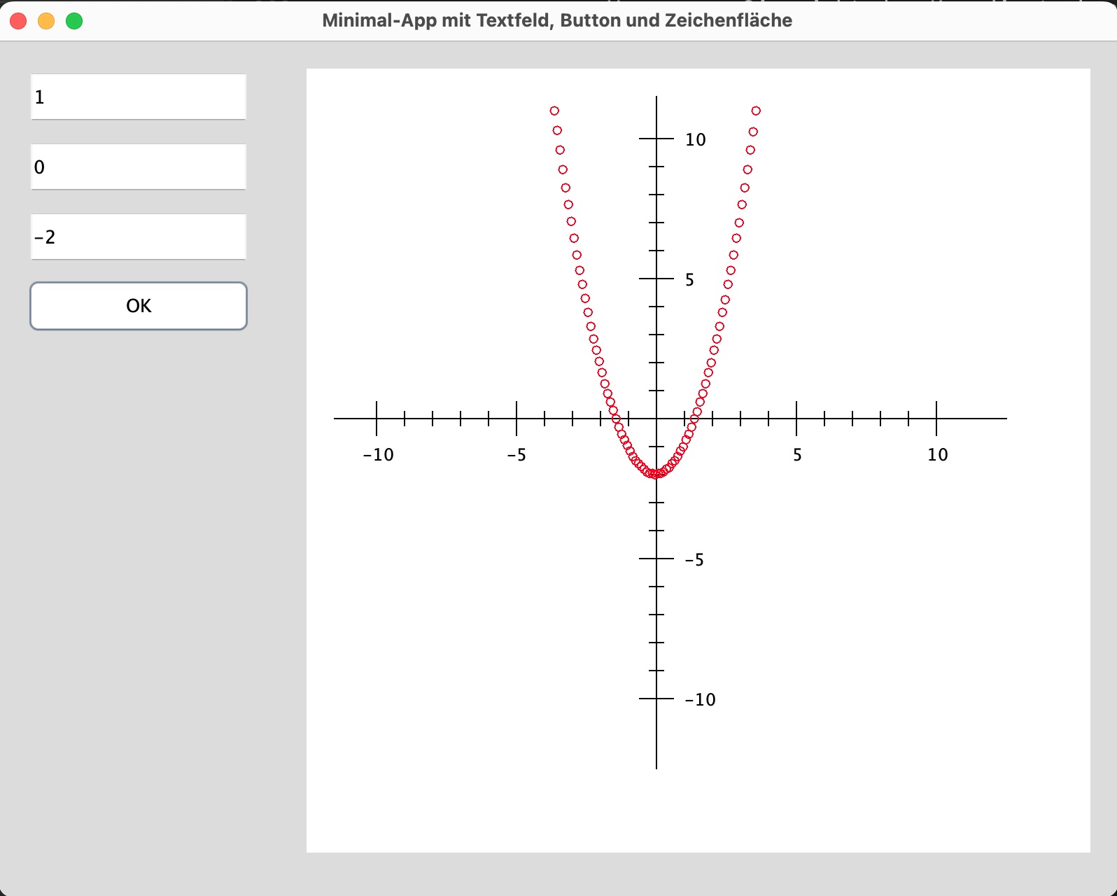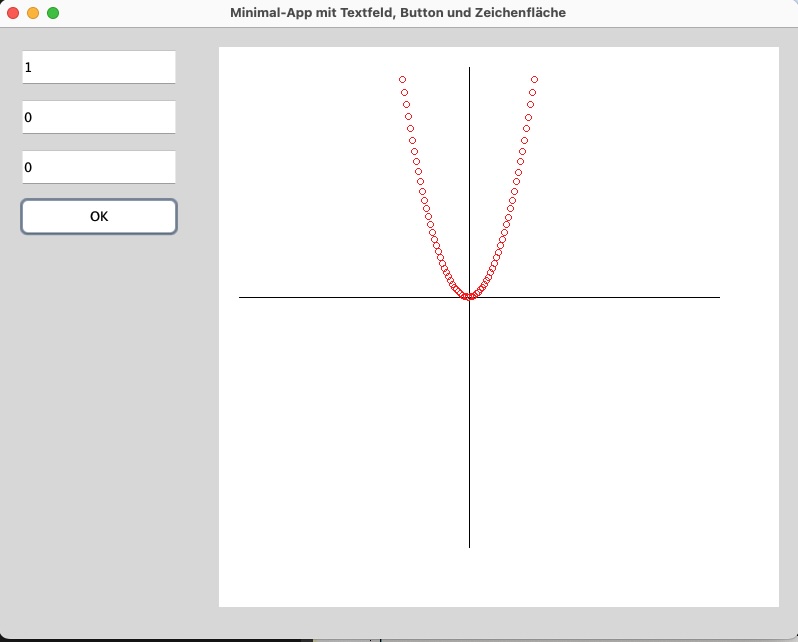 Testen Sie Ihre App nun, in dem Sie in die drei Text-Felder unterschiedliche Zahlenwerte eingeben und dann den OK-Button klicken. Es sollte immer eine Parabel in der Zeichenfläche erscheinen.