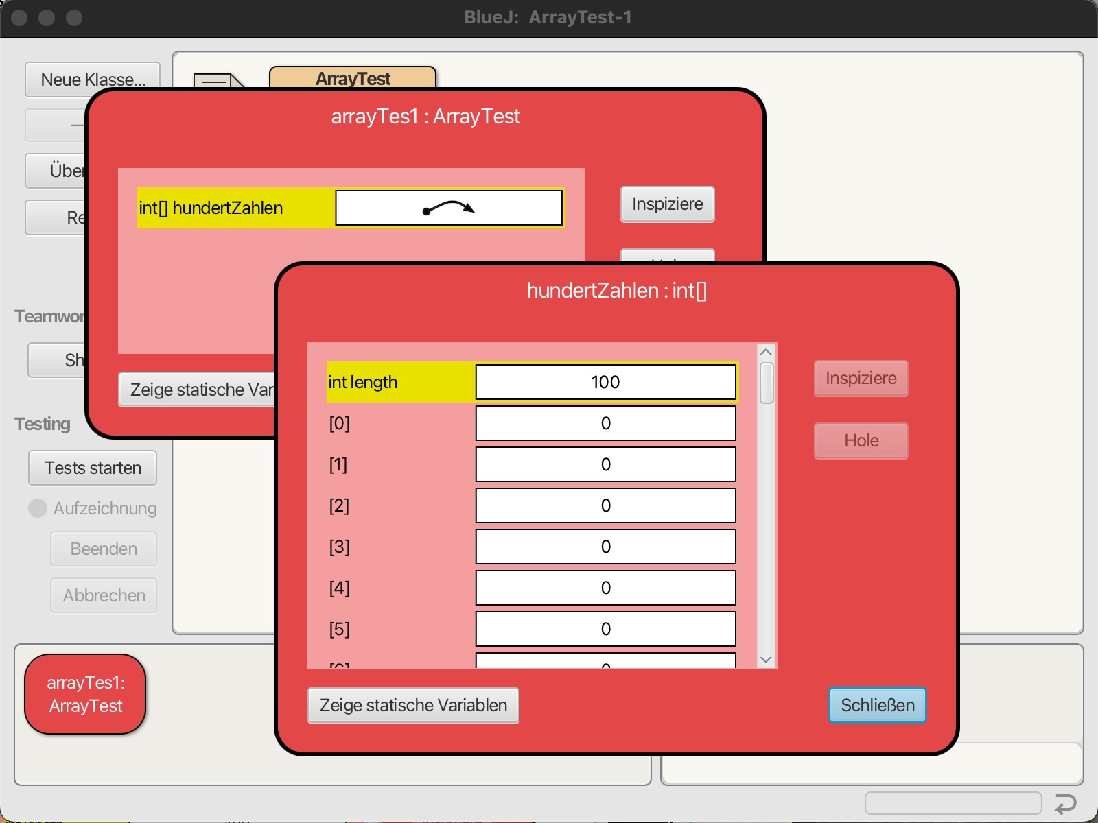 Mit Hilfe des Objektinspektors von BlueJ können wir uns diese 100 Zahlen ansehen, die in dem Array gespeichert sind. Dazu reicht ein Doppelklick auf den gebogenen Pfeil: