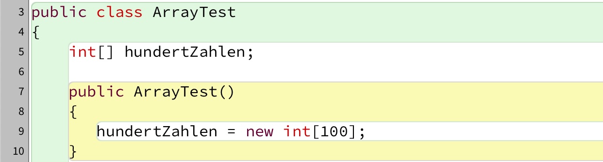 In Zeile 5 finden wir die Deklaration des Arrays hundertZahlen. Wir teilen dem Programm damit mit, dass wir ein Array aus int-Variablen benötigen, der als "hundertZahlen" bezeichnet werden soll.