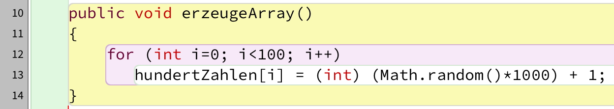 In der for-Schleife wird dann jedem der 100 Arrayelement eine Zufallszahl im Bereich zwischen 1 und 1000 zugewiesen. Die Methode nextInt() des Objektes Random.generator liefert eine Zufallszahl zwischen 0 und 999, da noch 1 addiert wird, erhält man eine Zahl zwischen 1 und 1000.