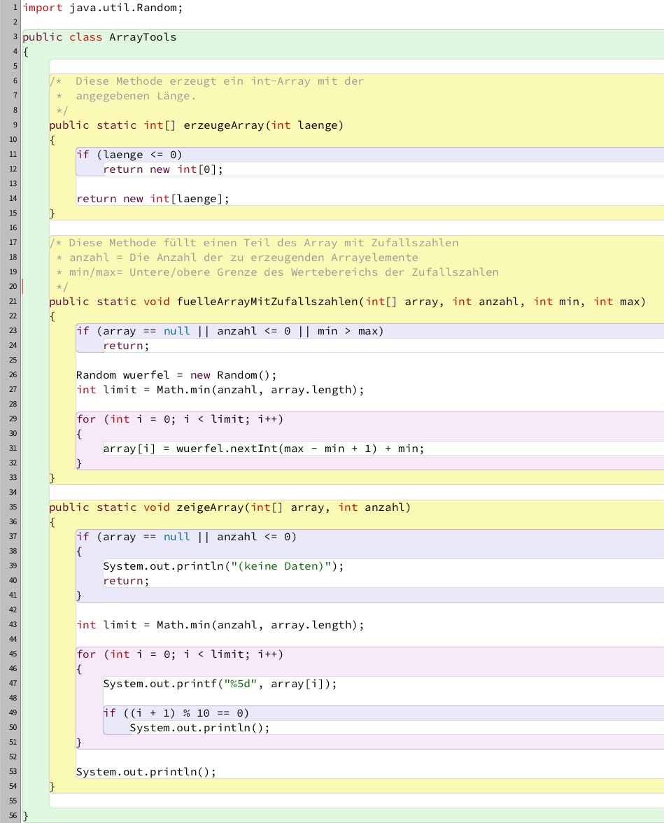Die Methode fuelleArrayMitZufallszahlen(int[] array, int anzahl, int min, int max) füllt die ersten anzahl Elemente eines vorhandenen int-Arrays mit Zufallszahlen. Die erzeugten Werte liegen im Bereich von min bis max (jeweils einschließlich). Dabei wird nur so viele Werte eingetragen, wie sowohl im Array Platz ist als auch durch anzahl vorgegeben werden. Auf diese Weise lassen sich beliebige Arrays schnell mit Testdaten versehen.
