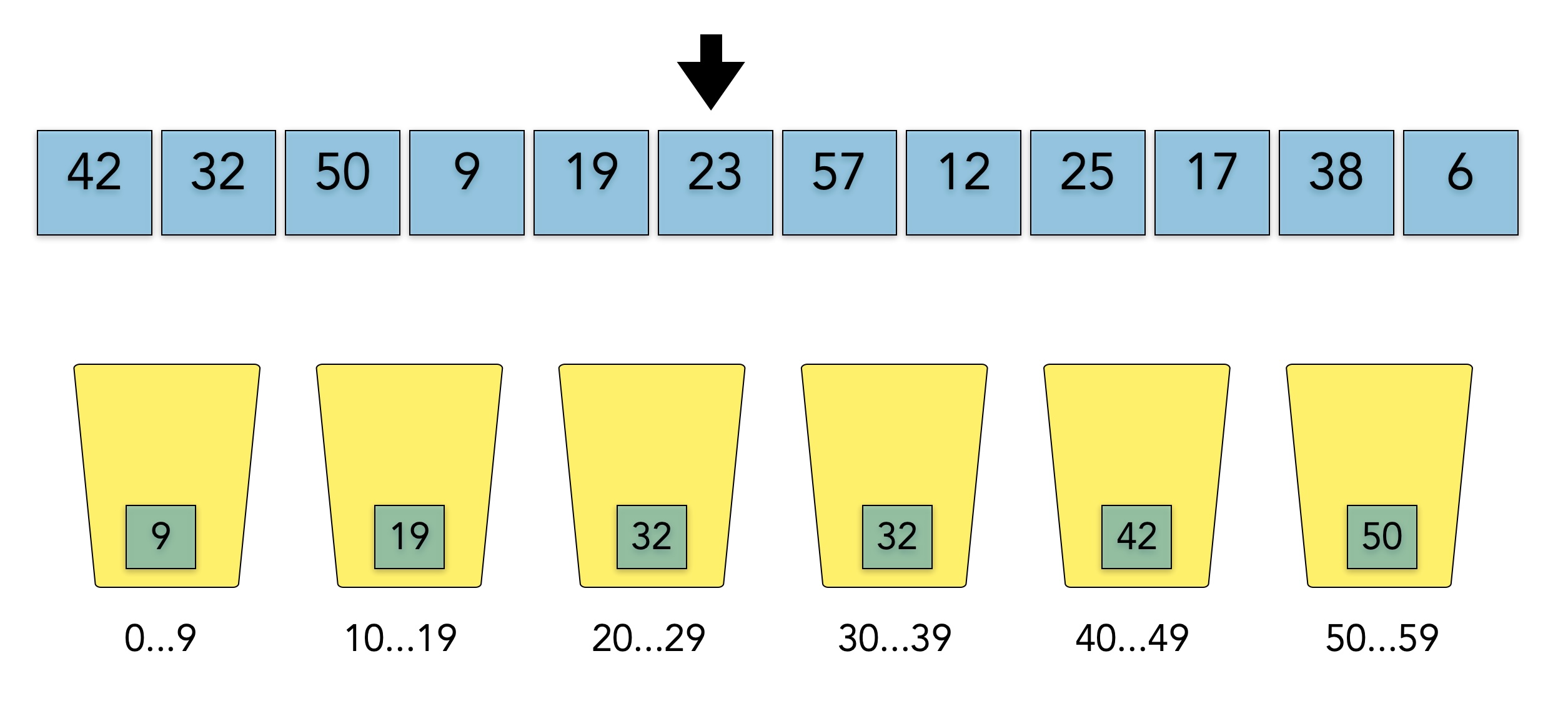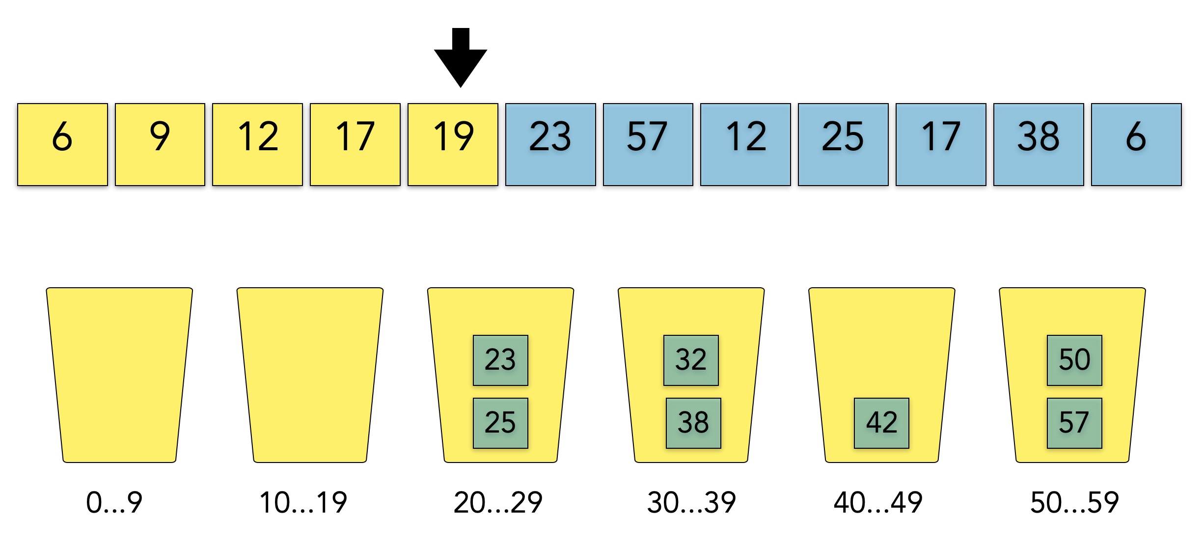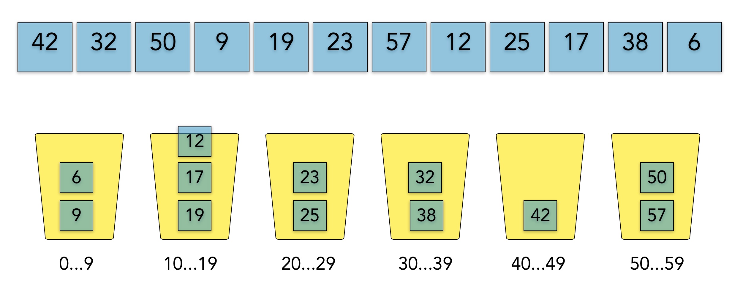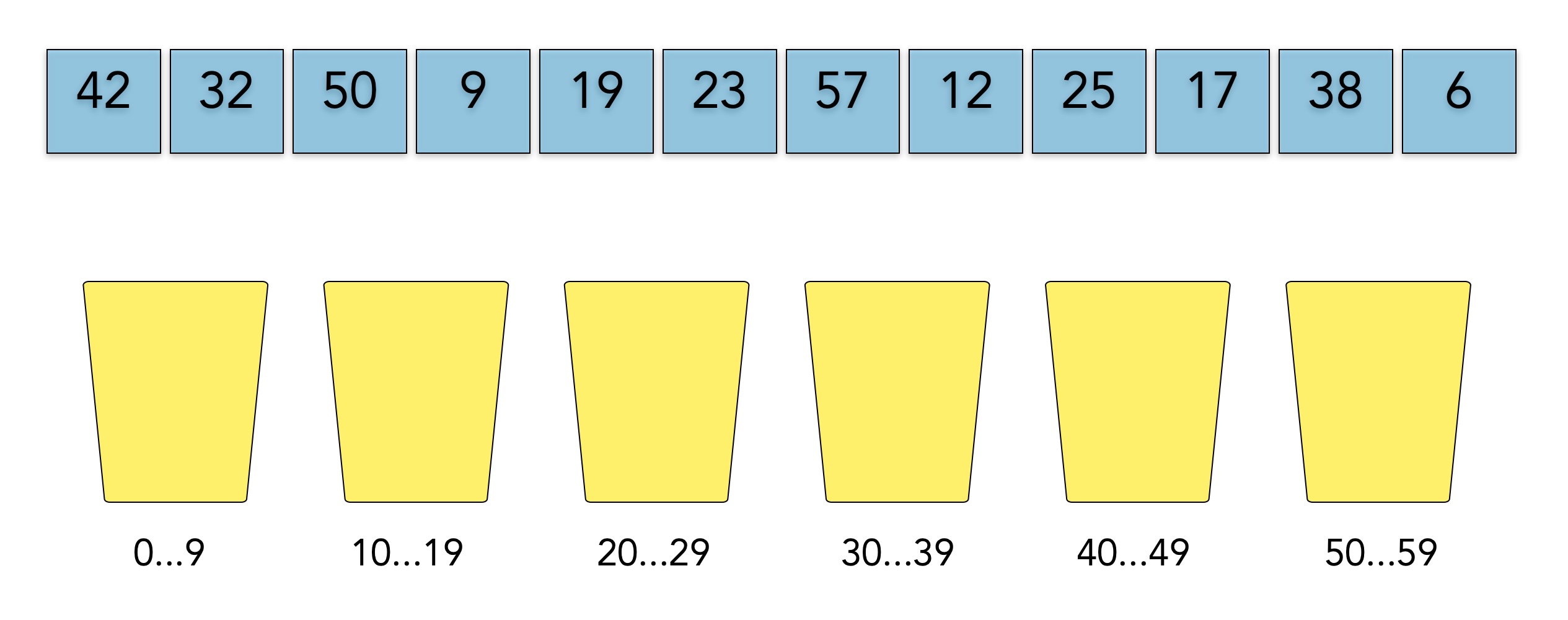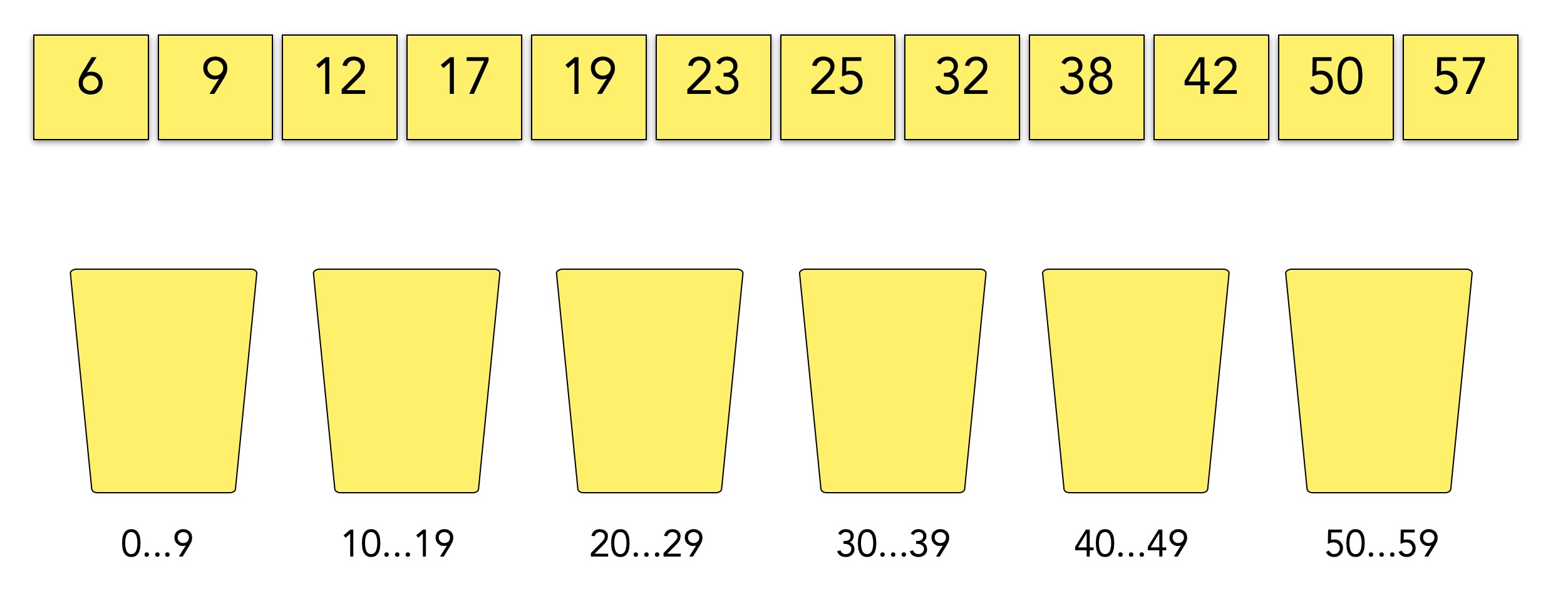 Dieses Bild zeigt einen kleinen Array mit Zahlen im Bereich 6 bis 57. In der unteren Reihe sehen wir sechs Eimer, engl. Buckets, die Arrayelemente aufnehmen können. Der erste Eimer ist für die Zahlen 0 bis 9 zuständig, der zweite für die Zahlen 10 bis 19 und so weiter. Der letzte Eimer schließlich kann die Zahlen 50 bis 59 aufnehmen.