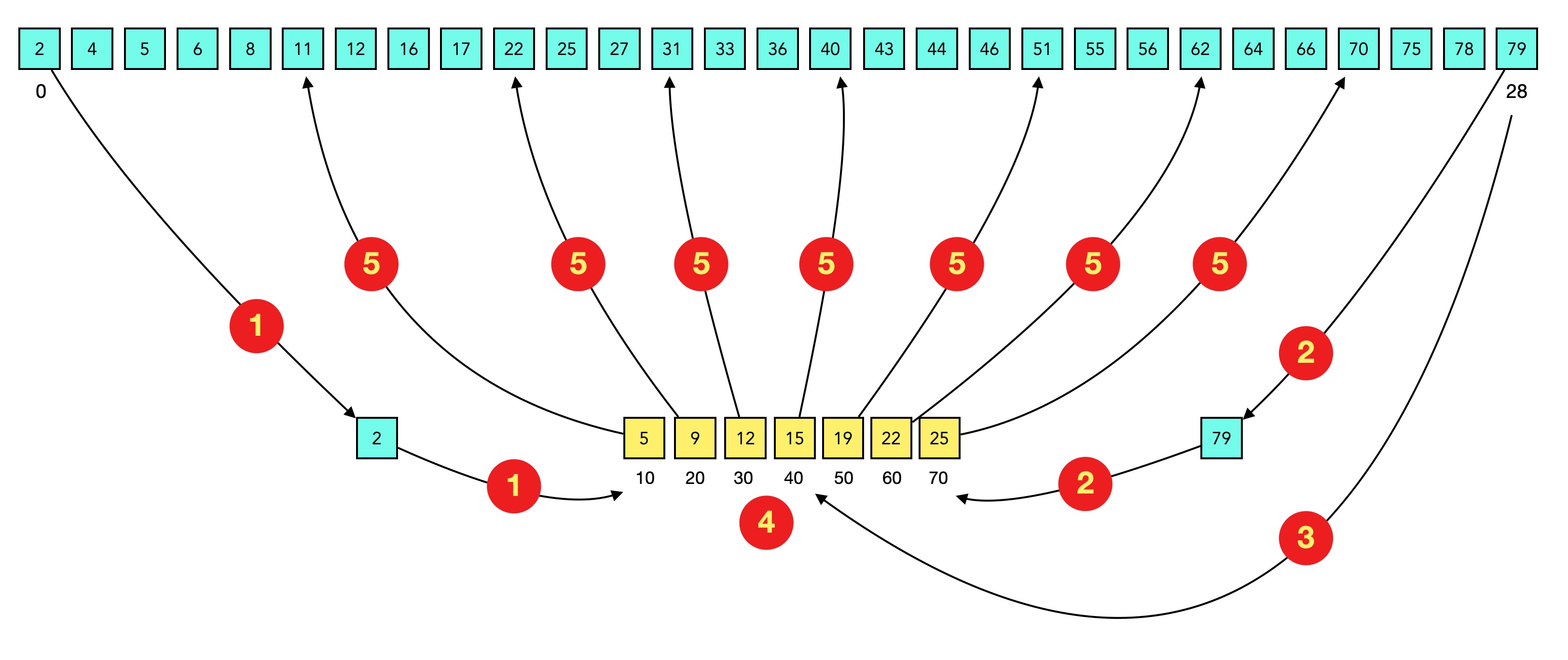 Wir sehen hier eine Array aus 29 int-Zahlen, die aufsteigend sortiert sind - von 2 bis 79. Das Bild soll das Prinzip des Index Search verdeutlichen.