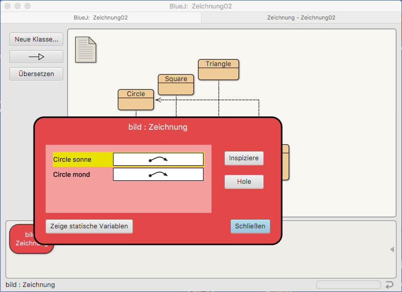 ⇒ Kompilieren Sie den Quelltext, erzeugen Sie ein Objekt bild der Klasse Zeichnung, und klicken Sie dann mit der rechten Maustaste auf den roten Kasten für das Objektbild.