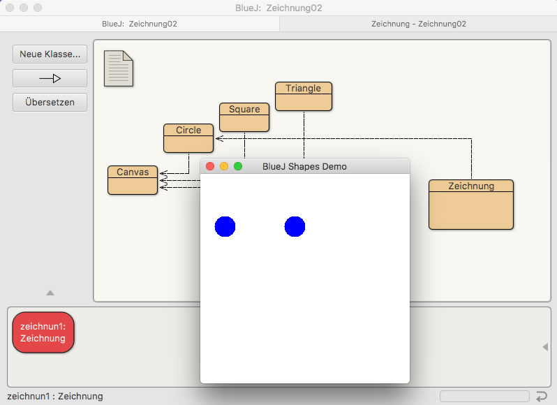 Wenn wir jetzt ein neues Objekt der Klasse Zeichnung erzeugen, dann erscheint sofort ein kleines Fenster auf dem Bildschirm und zeigt uns die beiden Kreise an. Wir müssen nicht mehr mit der Maus die beiden Methoden in dem Kontextmenü aktivieren, das erspart uns in Zukunft viel Zeit.