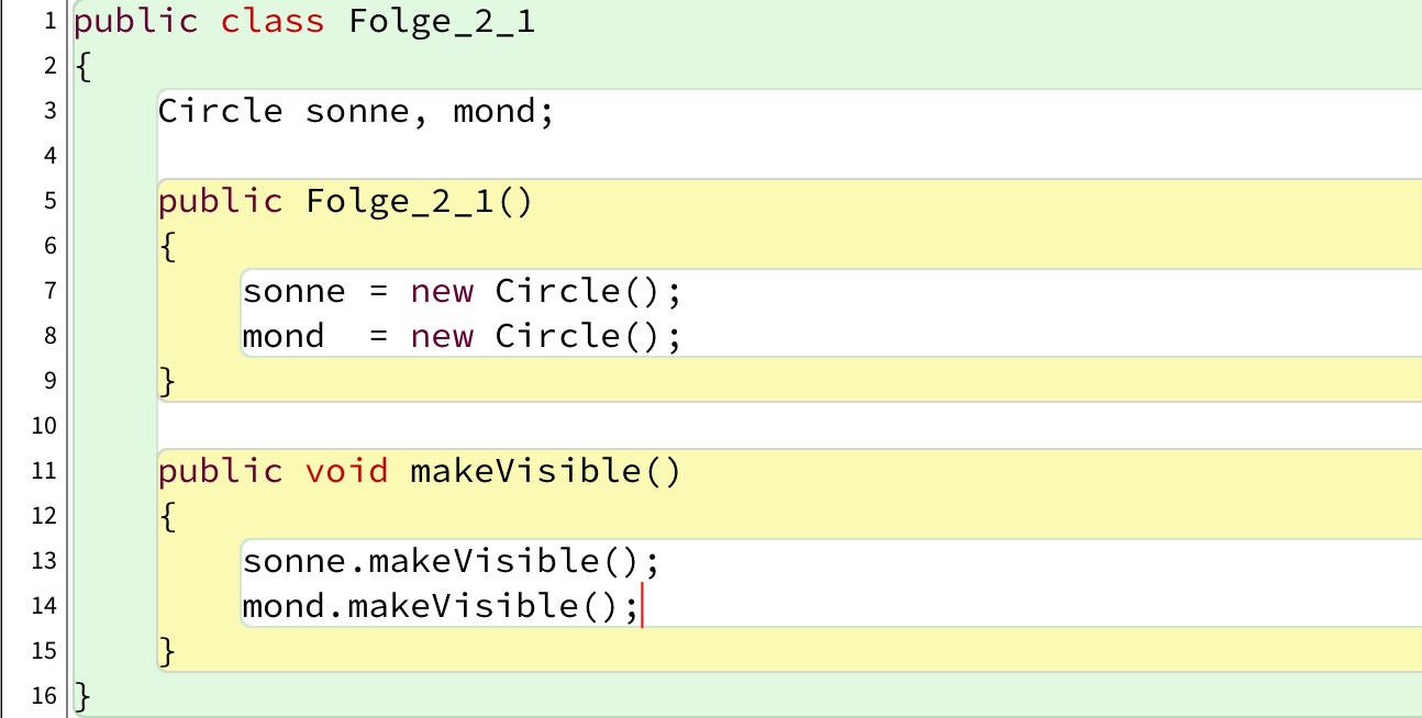 Der äußere Rahmen der gesamten Klasse Folge_2_1 ist hier grün hervorgehoben. Der Konstruktor dieser Klasse Folge_2_1() ist dagegen gelb markiert.