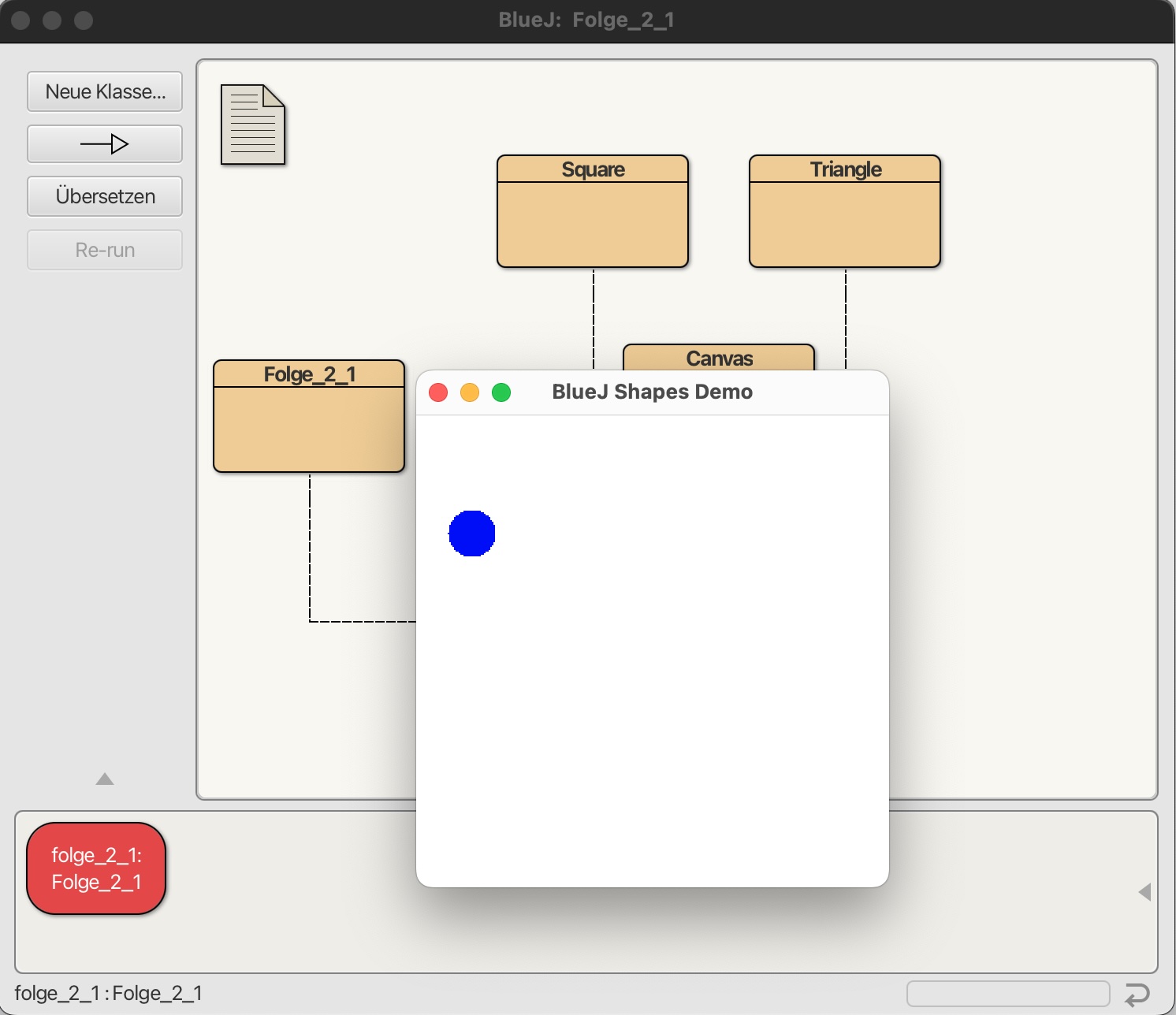 ⇒ Jetzt ist Zeit, etwas herumzuspielen. Ergänzen Sie den Quelltext um mindestens zwei weitere Objekte, vielleicht auch der Klassen Square und Triangle. Verschieben Sie die Objekte, verändern Sie ihre Größe und Farbe. Vielleicht schaffen Sie es ja auch, ein kleines Bild zu zeichnen.