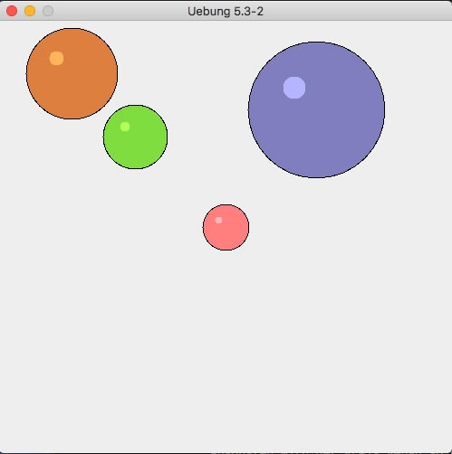 Ihre Aufgabe ist es nun, die Klasse Circle so zu verändern, dass ein solcher Glanzpunkt in die linke obere Ecke einer Kugel gesetzt wird. Der Durchmesser dieses Glanzpunktes sollte dabei vom Durchmesser der Kugel abhängen; je größer die Kugel, desto größer auch der Durchmesser des Glanzpunktes.