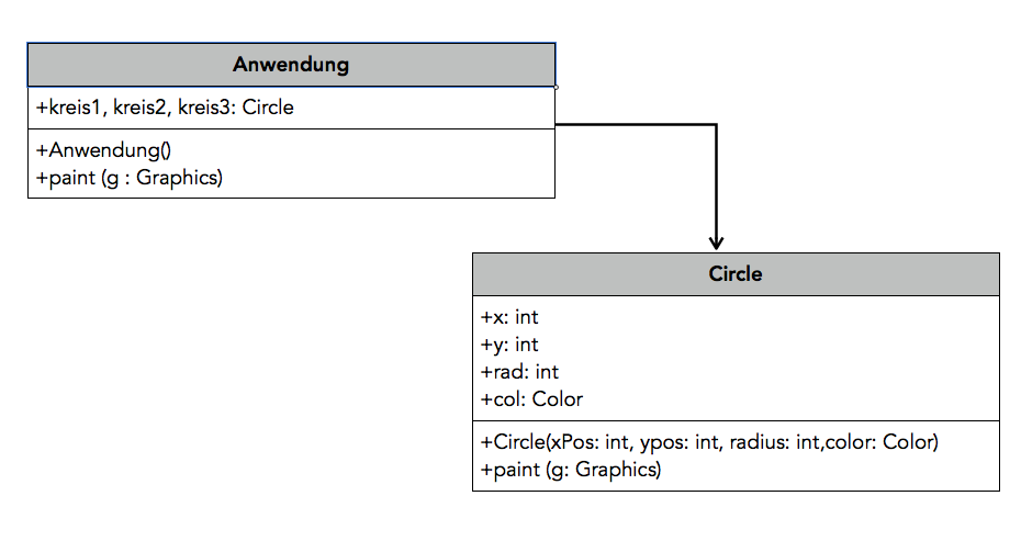 Im zweiten Fach werden die relevanten Attribute der Klasse aufgelistet, und zwar in einer etwas anderen Syntax als bei Java üblich. Das liegt daran, dass diese Diagramme unabhängig von einer bestimmten Programmiersprache sein sollen. Aber schwer zu verstehen sind diese Diagramme nicht. Man sieht bei der Klasse Anwendung zum Beispiel, dass es drei Attribute der Klasse Circle gibt, die kreis1 bis kreis3 heißen.