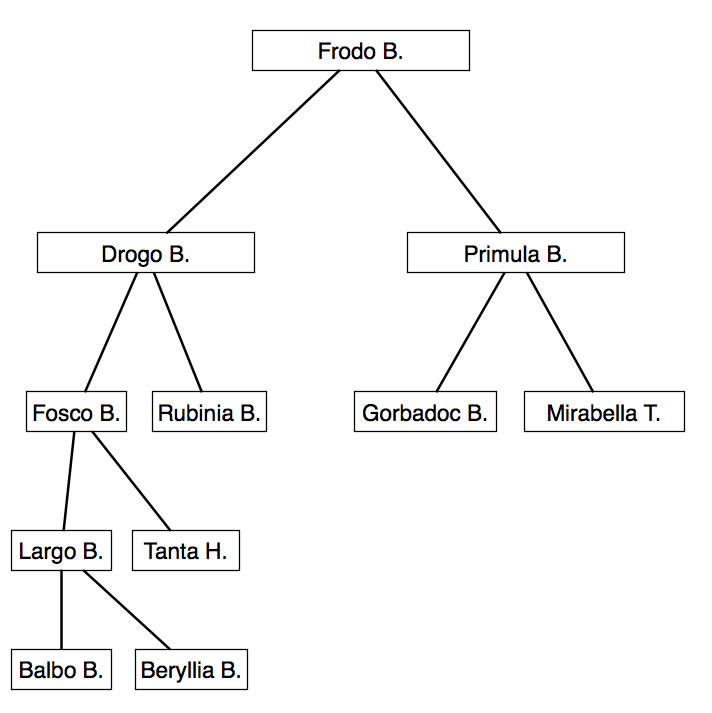 Eine mögliche Lösung könnte zum Beispiel aussehen, mit der "Wurzel" Frodo ganz oben, damit die Struktur des Binärbaums sichtbar wird.