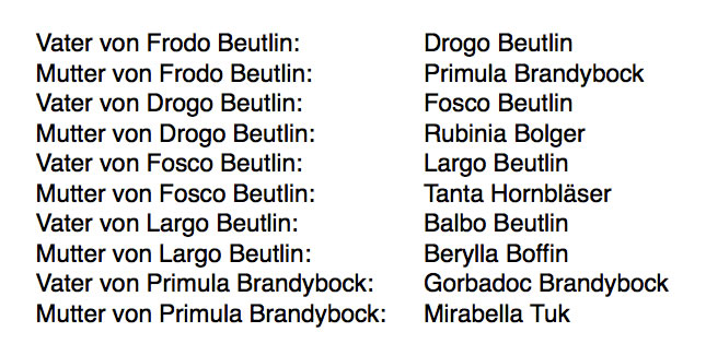wäre zum Beispiel die Vorfahrenlinie von Balbo zu Frodo: vvvv, weil Balbo der Vater vom Vater vom Vater vom Vater von Frodo ist. Die Vorfahrenlinie zu Rbinia wäre entsprechend kürzer: vm.