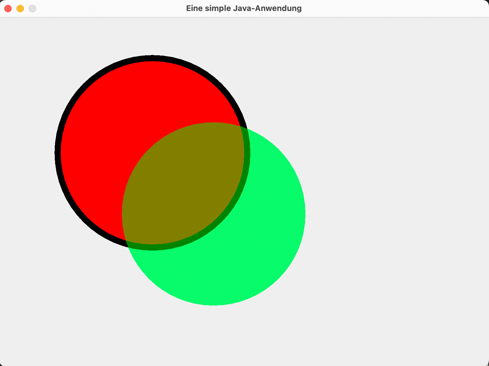 Wenn der rote Kreis mit dem dicken schwarzen Rand gezeichnet wurde, wird über den roten Kreis ein grüner Kreis gelegt, allerdings nach rechts und nach unten um 100 Pixel verschoben. Die Transparenz dieses zweiten Kreises wurde auf den Wert 127 gesetzt, das ist die Hälfte des maximalen Wertes von 255.