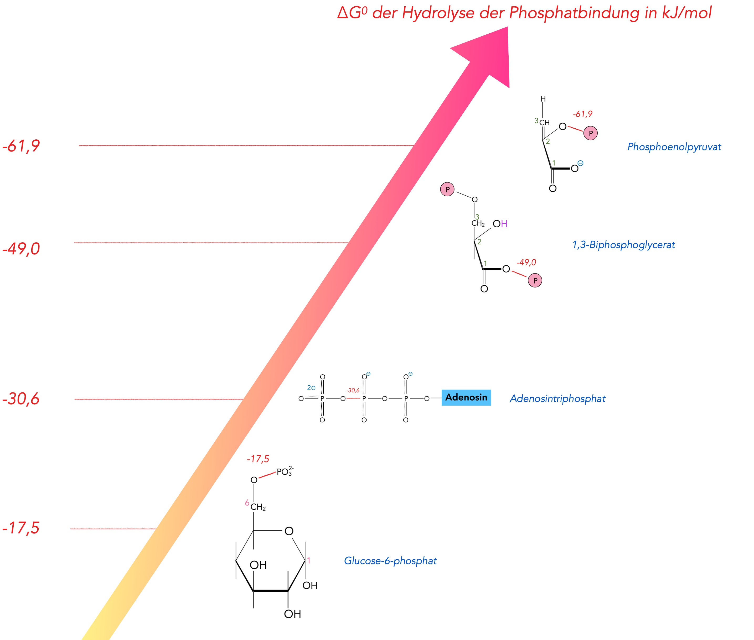 Im ersten Schritt der Glyolyse wird eine Phosphatgruppe vom ATP auf Glucose übertragen. Der ΔG0-Wert dieser neuen Bindung beträgt nur -17,5 kJ/mol. Das erklärt, warum diese Reaktion exotherm ist und so leicht abläuft.