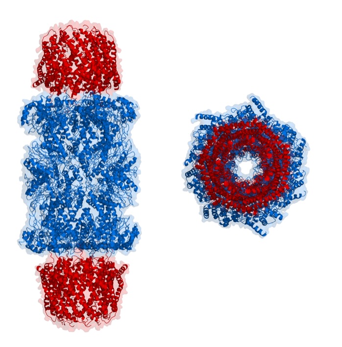 Die mittlere Untereinheit besteht aus vier Ringen, die aus jeweils sieben Untereinheiten bestehen. Diese vier heptameren Ringe sind dann zu einer Röhre bzw. einem Hohlzylinder übereinander gestapelt: