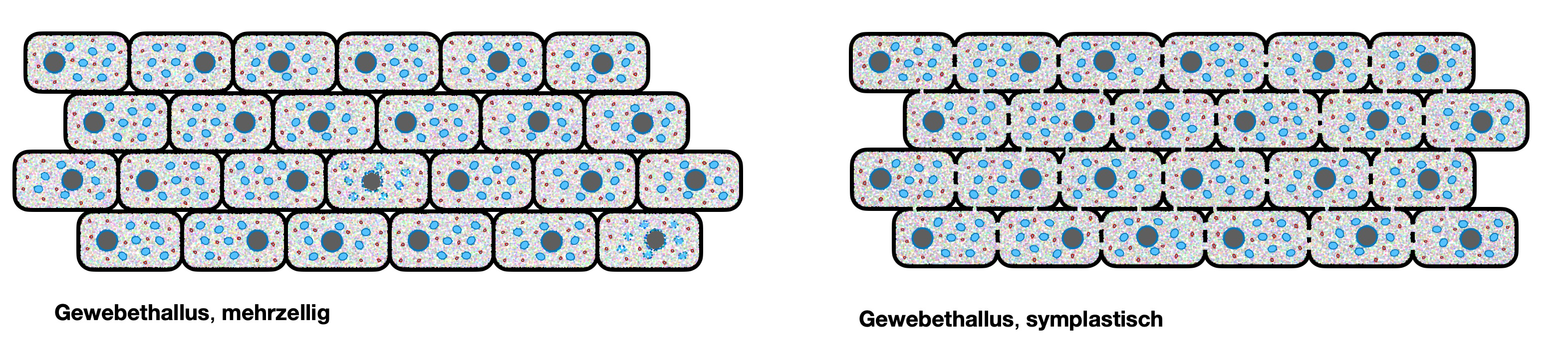 Dieses Bild zeigt zwei verschiedene Gewebethalli. Links sehen wir einen mehrzelligen Gewebethallus, wie er bei einfachen Pflanzen aus der Gruppe der mehrzelligen Algen vorkommt. Rechts sehen wie einen symplastisch organisierten Gewebethallus, wie er bei allen höheren Landpflanzen vorkommt. Bei den uns bekannten Landpflanzen, angefangen bei den Moosen, stehen - bis auf wenige Ausnahmen - alle lebenden Zellen untereinander in Kontakt durch Plasmabrücken. Sie bilden daher einen riesigen Symplasten.