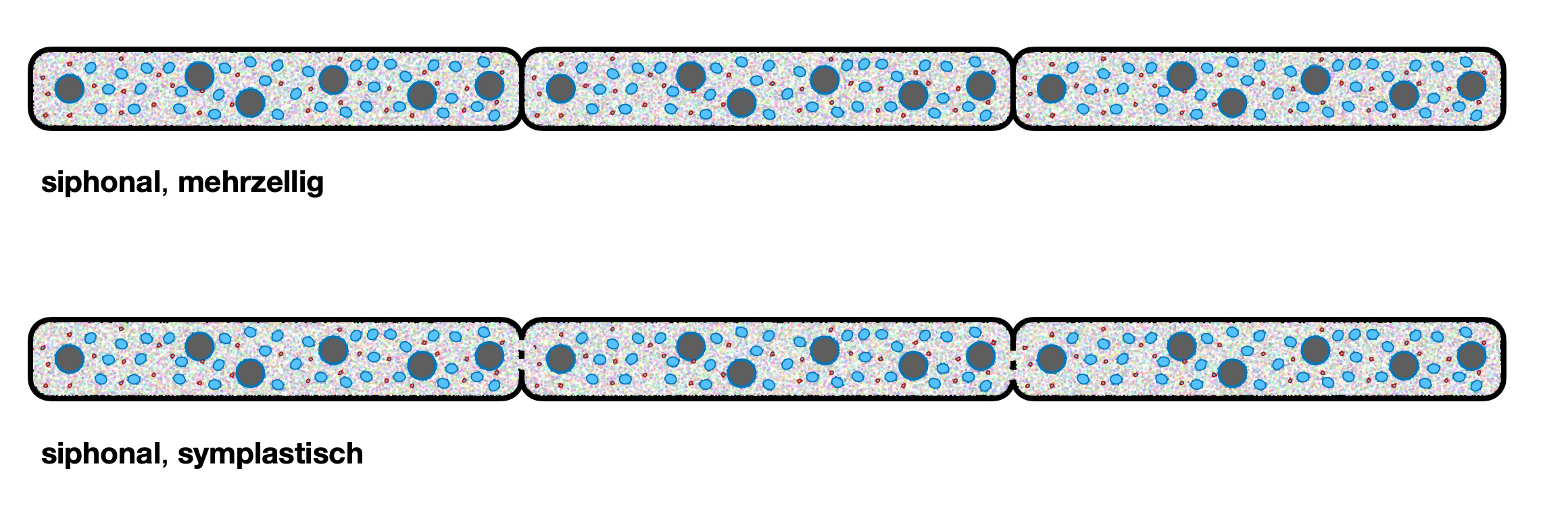 Dieses Bild zeigt die trichale oder fädige Organisationsform. Bei der mehrzelligen Variante ist zwar jede Zelle von einer Membran und einer Zellwand umgeben, die Zellen stehen aber nicht in direktem Kontakt miteinander. Bei der symplastischen Organisationsform bestehen Plasmabrücken zwischen den Zellen. Hier können also Stoffe und Informationen von Zelle zu Zelle ausgetauscht werden. Alle Zellen zusammen bilden dann einen großen Symplasten.