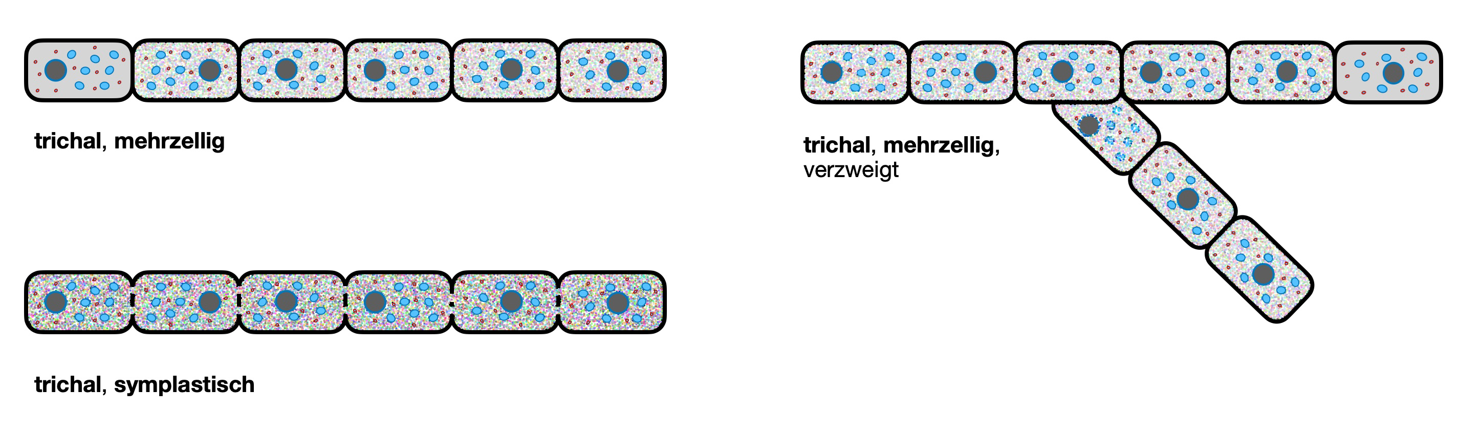 Beide Formen, sowohl die mehrzellige wie auch die symplastische, können unverzweigt oder verzweigt vorliegen.