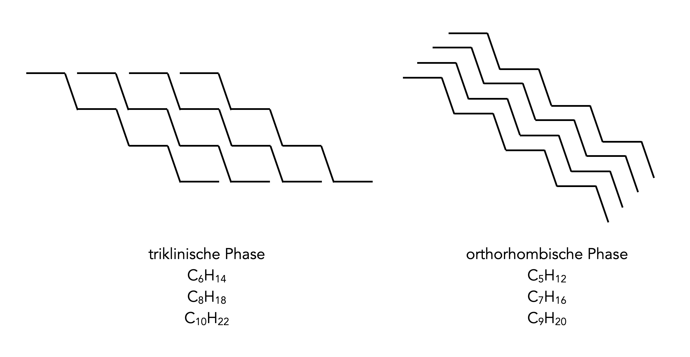 Dieses Bild zeigt typische Kristallgitter von geraden und ungeraden Alkanen. Wie man leicht erkennen kann, sind gerade Alkane im festen Zustand nicht so dicht gepackt (triklinische Phase) wie ungerade Alkane (orthorhombische Phase) [6].