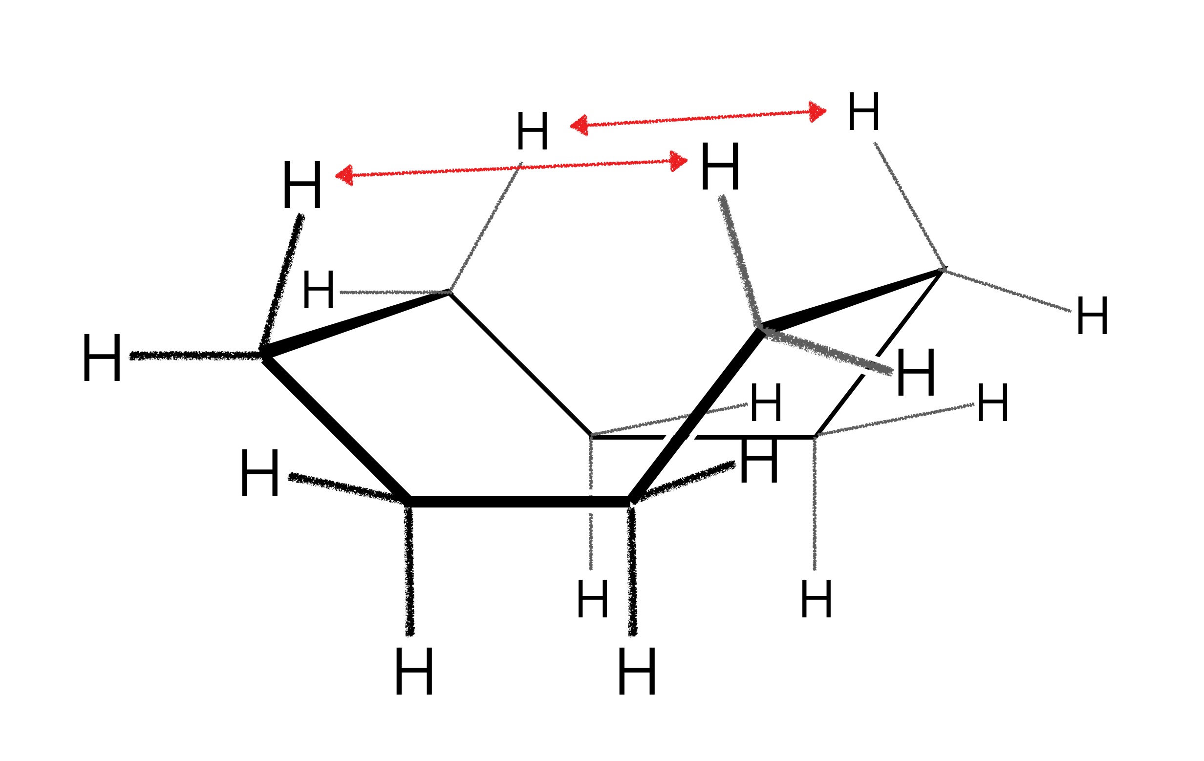 Hier sehen wir ein Cyclododecan-Molekül. Das Molekül hat sich so gefaltet, dass die Winkelspannung minimal ist und dass auch die Torsionsspannung nicht allzu hoch ist. Trotdem kommen sich drei oder vier der H-Atome im Innern des Rings so nahe, dass van-der-Waals-Abstoßungskräfte zur Wirkung kommen (durch die weißen Doppelpfeile gekennzeichnet). Genauer gesagt, handelt es sich bei diesern Abstoßungskräften um die sogenannte Pauli-Abstoßung durch Überlappung besetzter Elektronenwolken.