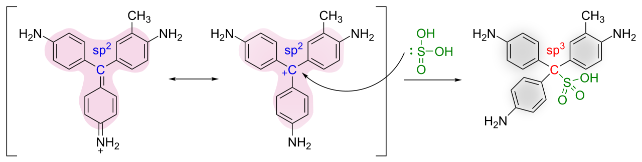 Die Entfärbung des Fuchsins kommt dadurch zustande, dass sich die Schwefelsäure an das zentrale sp2-hybridisierte C-Atom des Fuchsin setzt, welches dadurch in den sp3-hybridisierten Zustand wechselt. Das große aromatische System der delokalisierten pi-Elektronen wird dadurch unterbrochen und in drei kleine pi-Systeme unterteilt. Der HOMO-LUMO-Abstand in diesen drei pi-Systemen ist sehr viel kleiner als in dem großen pi-Systems des Fuchsins, daher wird nur noch farbloses UV-Licht absorbiert.