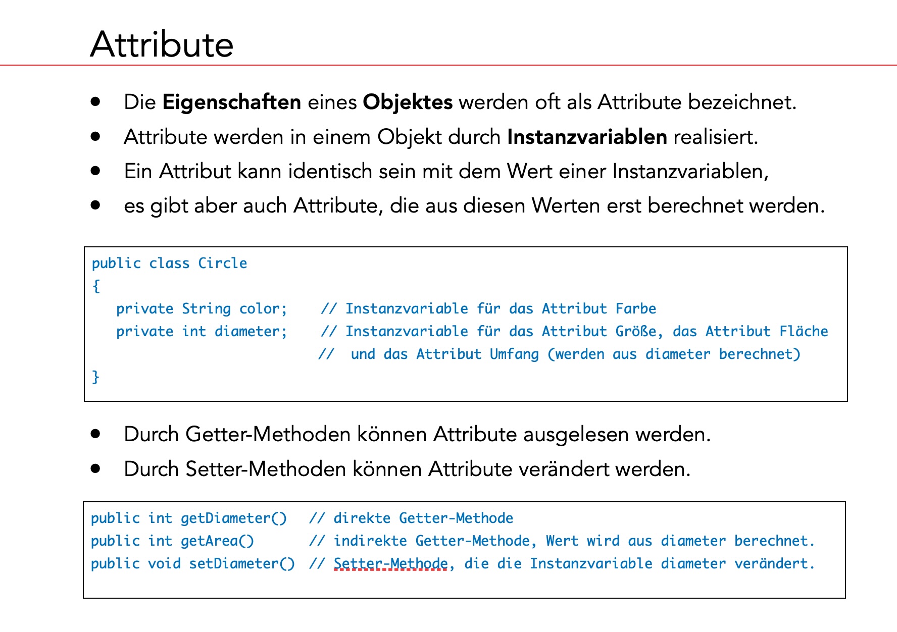 Interessant ist hier, dass eine sondierende Methode als Attribut gewertet wird. Damit soll wohl ausgedrückt werden, dass sich Attribute von Instanzvariablen dadurch unterscheiden, dass Attribute auch aus Instanzvariablen berechnet werden können.