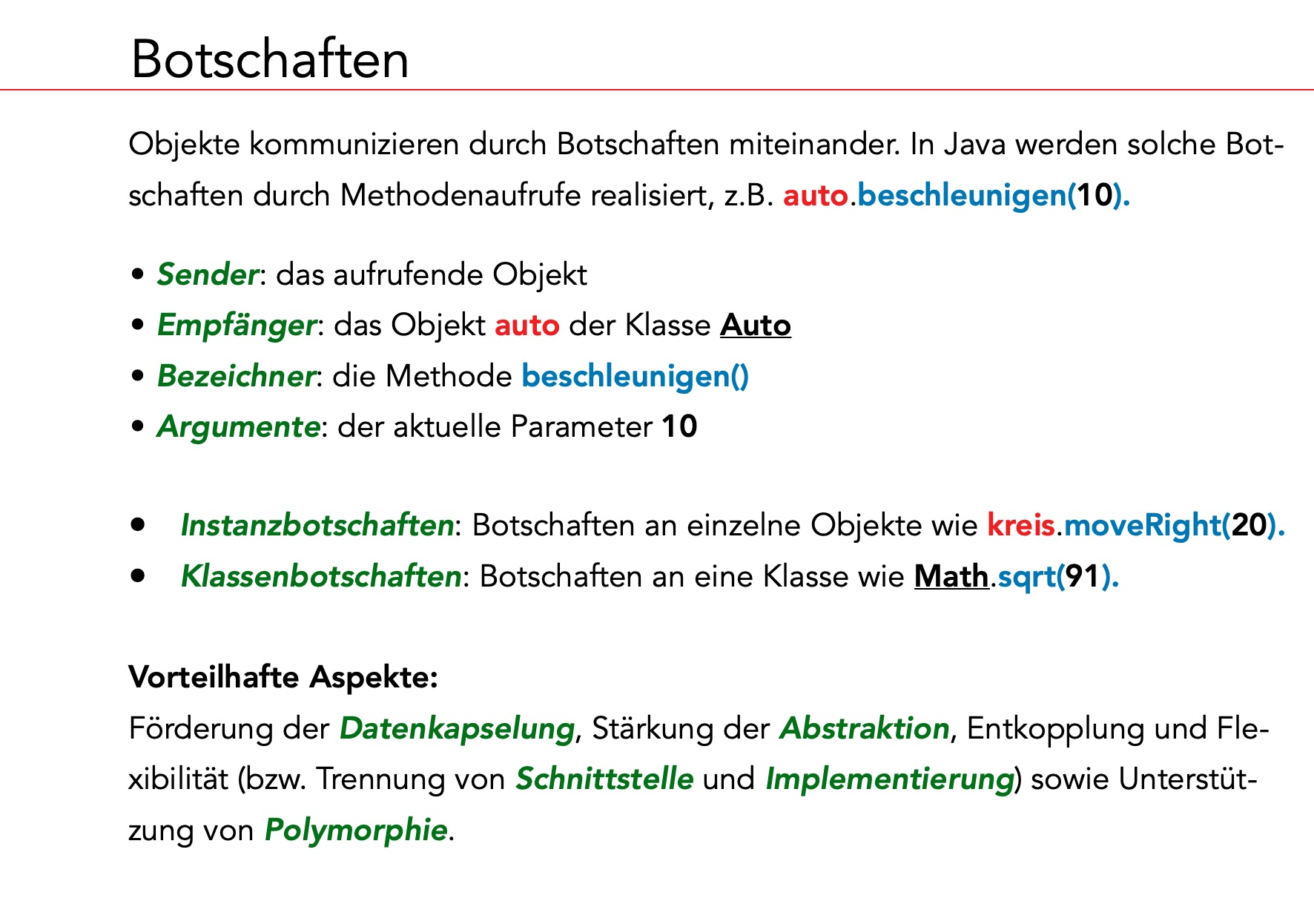 Die beiden ersten Beispiele stehen für sogenannte Instanzbotschaften - sie richten sich an eine Instanz einer Klasse, also an ein Objekt.