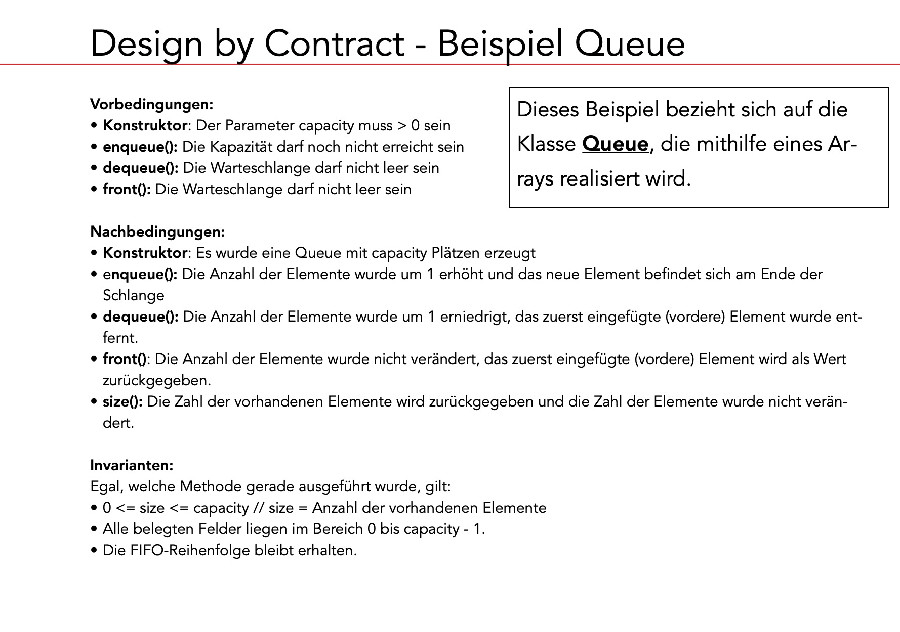 Dieses zweite Beispiel zeigt sehr gut, wie wichtig es ist, dass der interne Zustand eines Objektes wie einer Queue immer konsistent bleibt, unabhängig davon, wie oft enqueue(), dequeue() oder eine der anderen Methoden ausgeführt wurde. Gerade bei Datenstrukturen, die Abstrakte Datentypen verwirklichen (Stack, Queue, List etc.) sind Invarianten eine Garantie für Konsistenz.