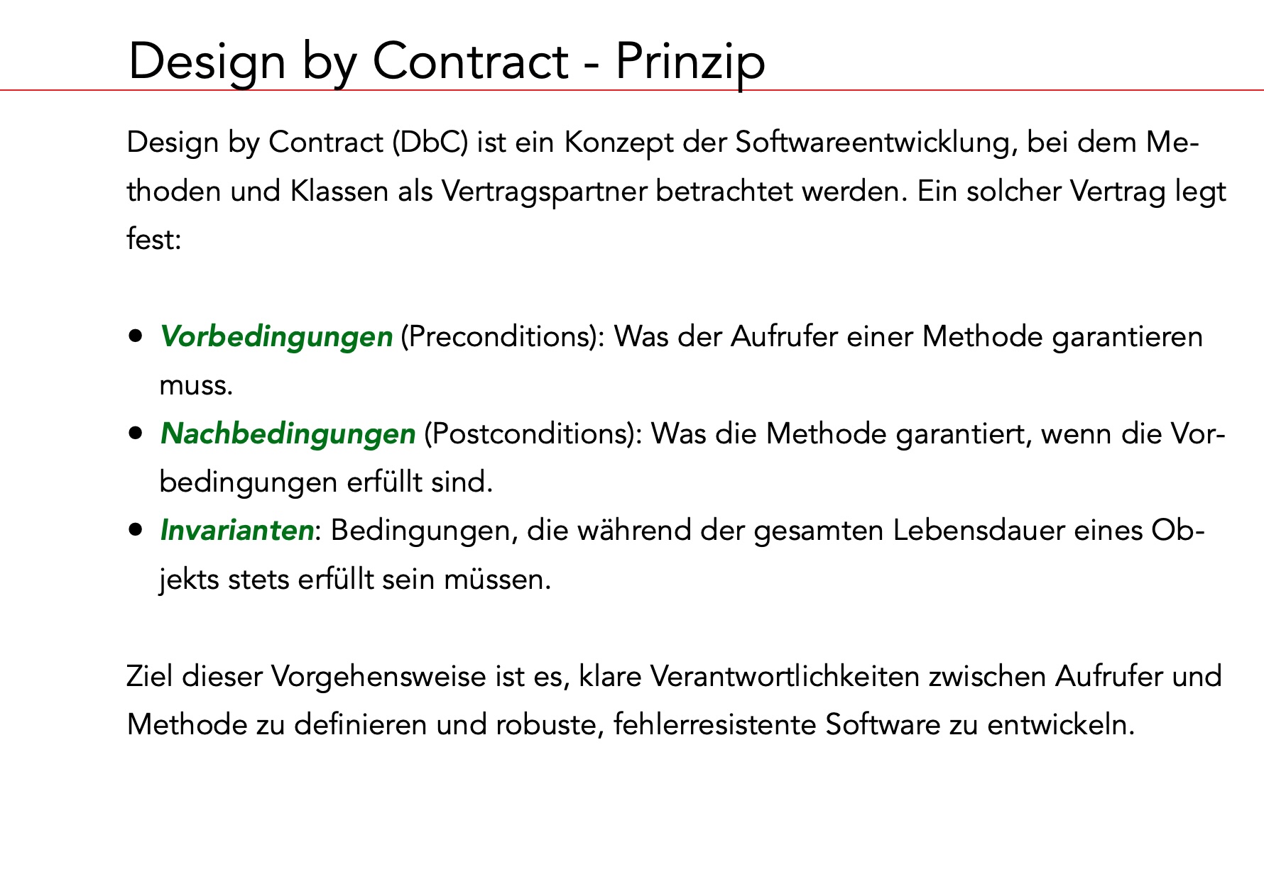 Ziel ist es, klare Verantwortlichkeiten zwischen Aufrufer und Methode zu definieren und robuste, fehlerresistente Software zu entwickeln.