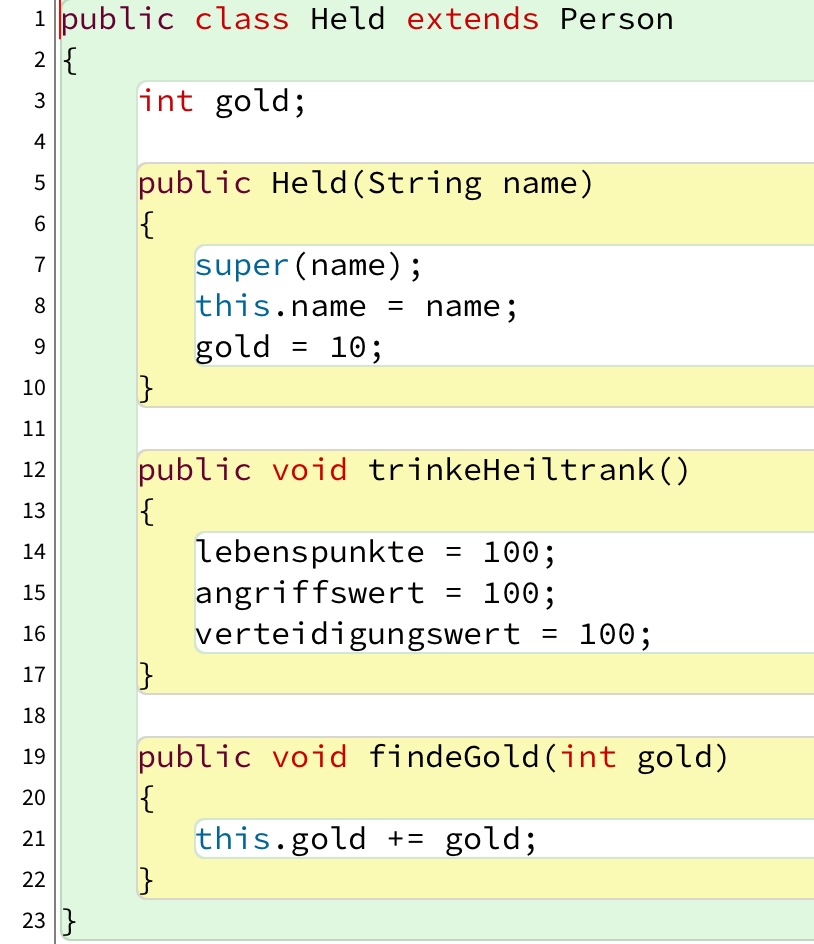 Dieses Bild zeigt den Quelltext der konkreten Klasse Held. Wie man an dem Schlüsselwort extends erkennen kann, handelt es sich bei dieser Klasse um eine Unterklasse der Klasse Person, es liegt also eine Vererbungsbeziehung vor.